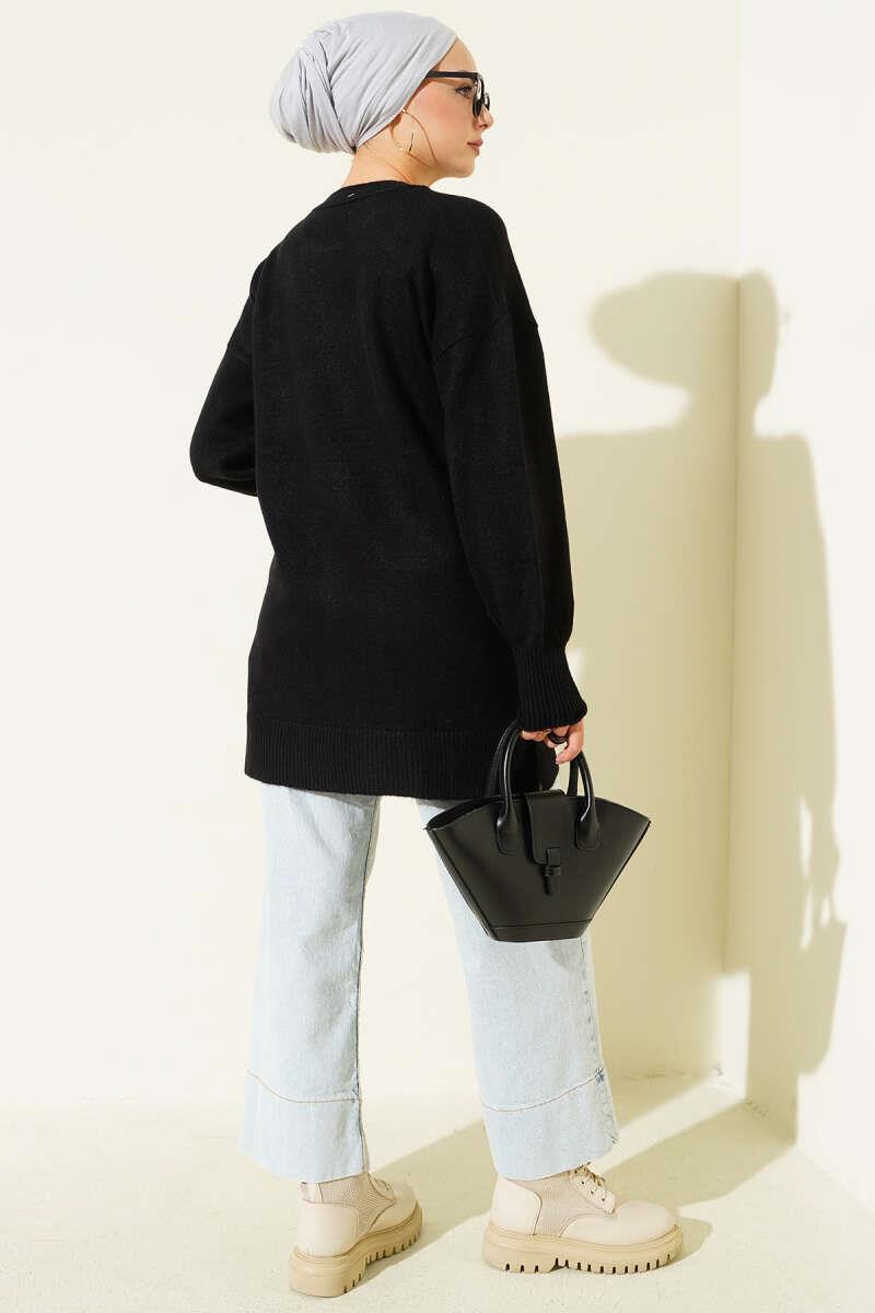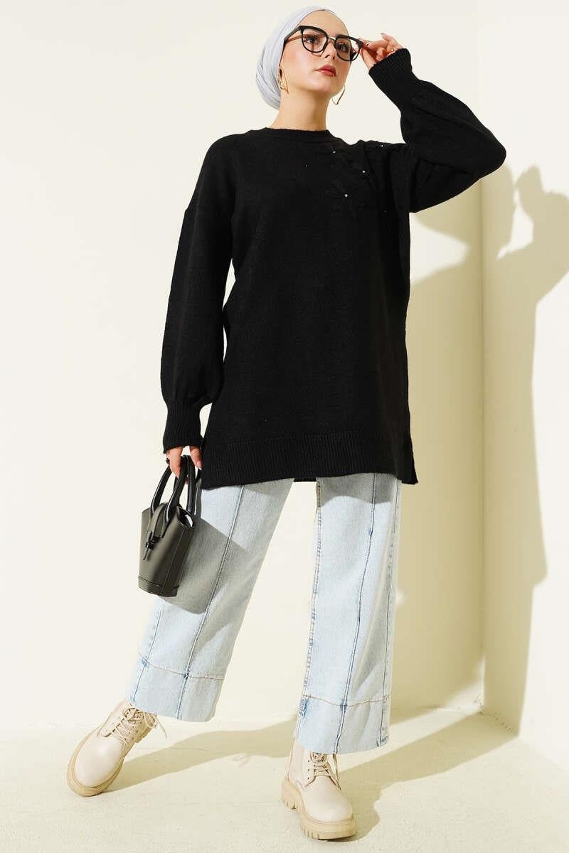 Yaka Çiçekli Yumoş Triko Tunik Siyah (0829-17021-688448)