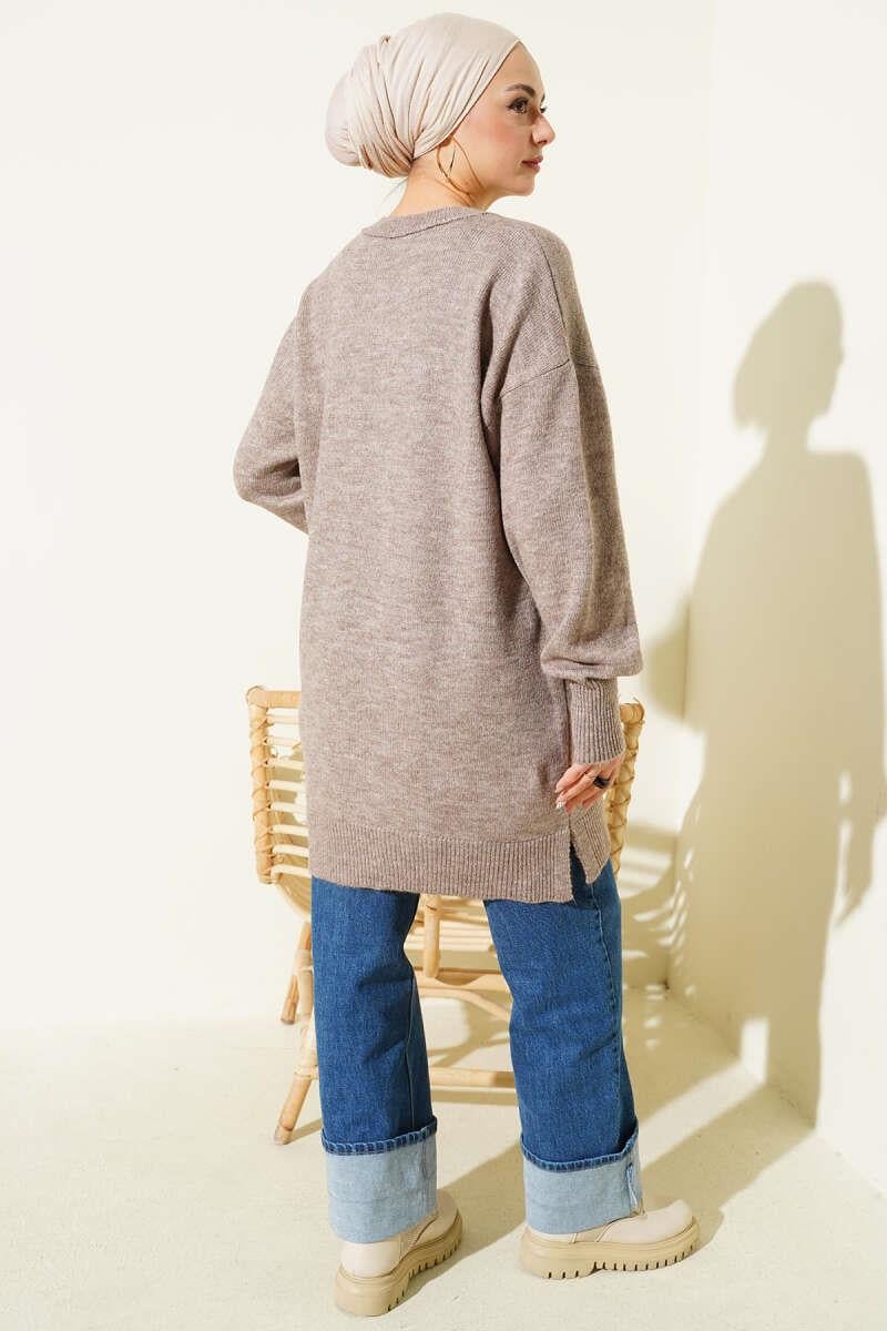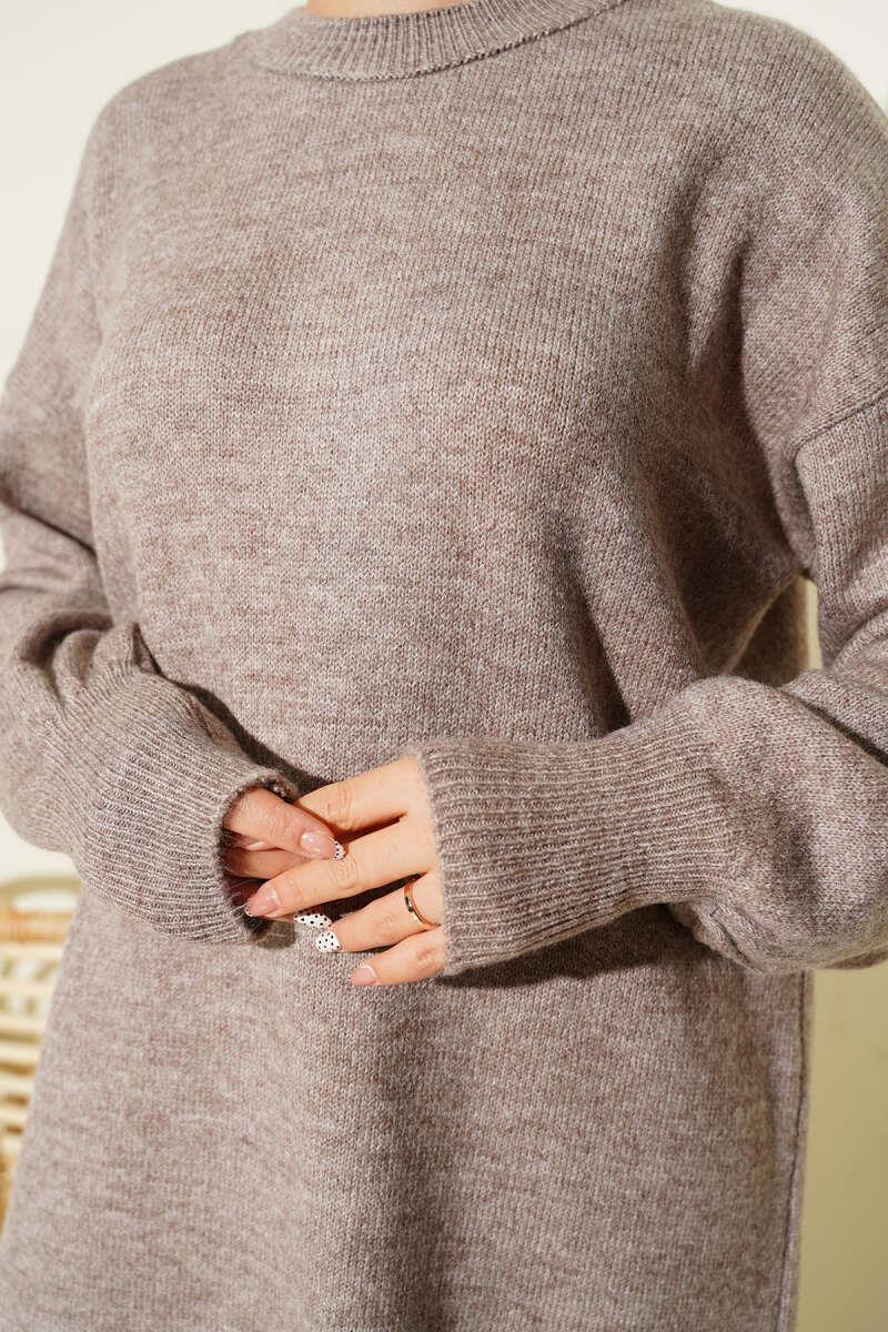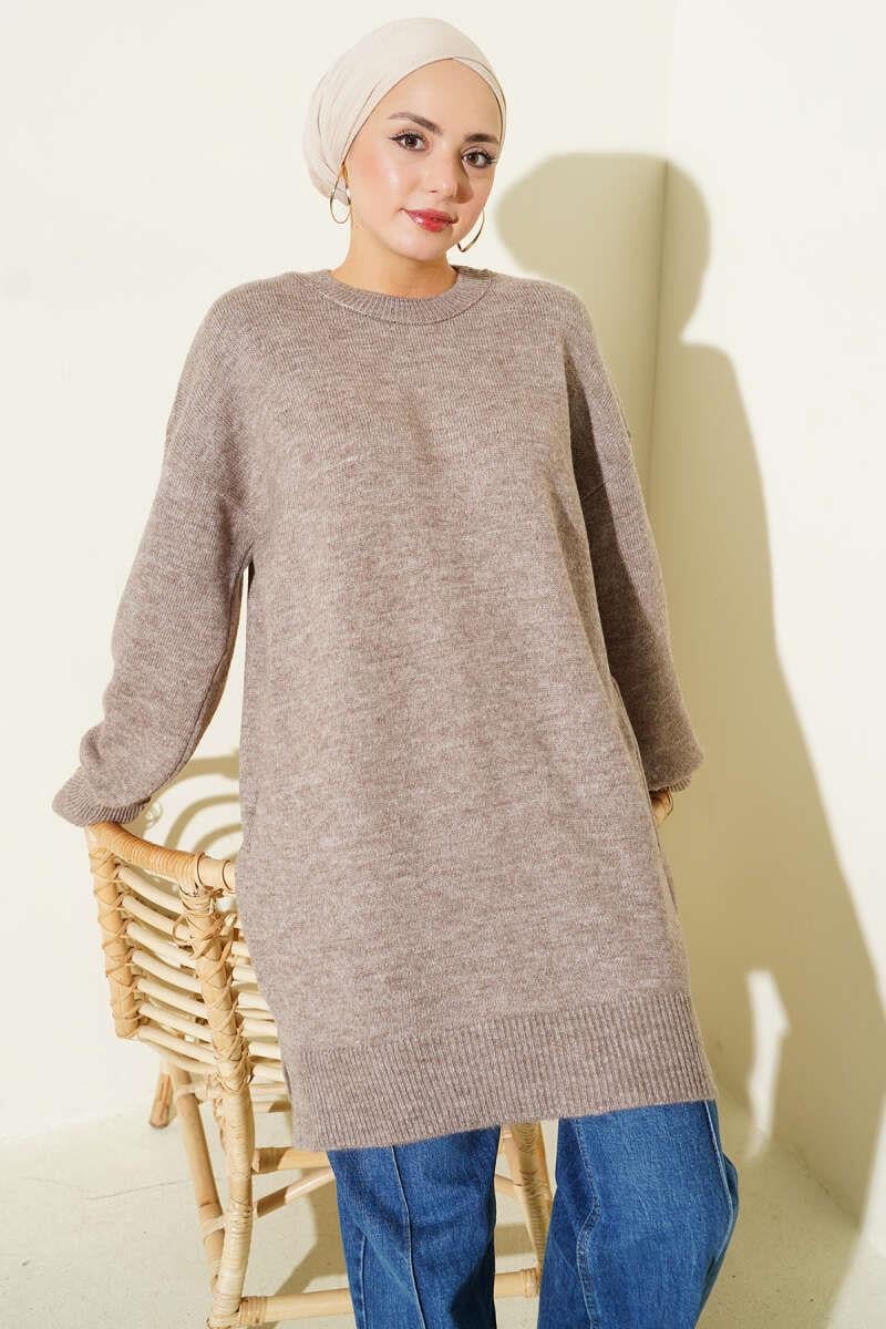 Yan Yırtmaçlı Yumoş Uzun Triko Tunik Vizon (0589-6013-678068)