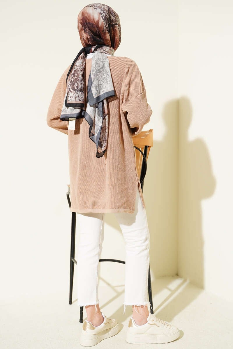 This essential piece offers both style and comfort with its V-neck design. Thanks to its soft knit fabric and loose fit, it elegantly covers body lines, while the small slits on the sides increase freedom of movement. With its minimalist style, this tunic, which can be easily combined with different pants and leggings, will be an indispensable addition to your daily wardrobe. Model Information: Height: 167 cm, Chest: 84 cm, Waist: 65 cm, Hips: 95 cm. The product on the model is size - Standard -.