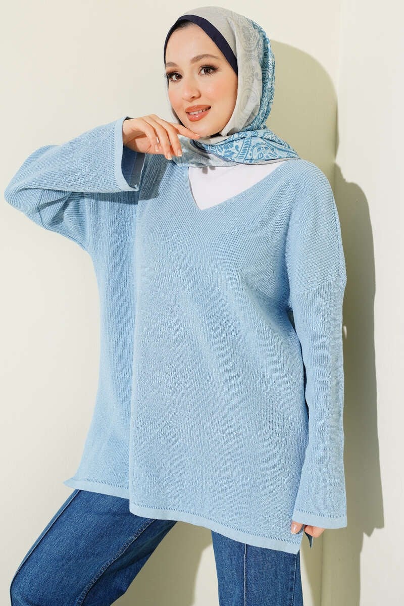 V-Neck Plain Knit Tunic Blue (0875-7188-737372)