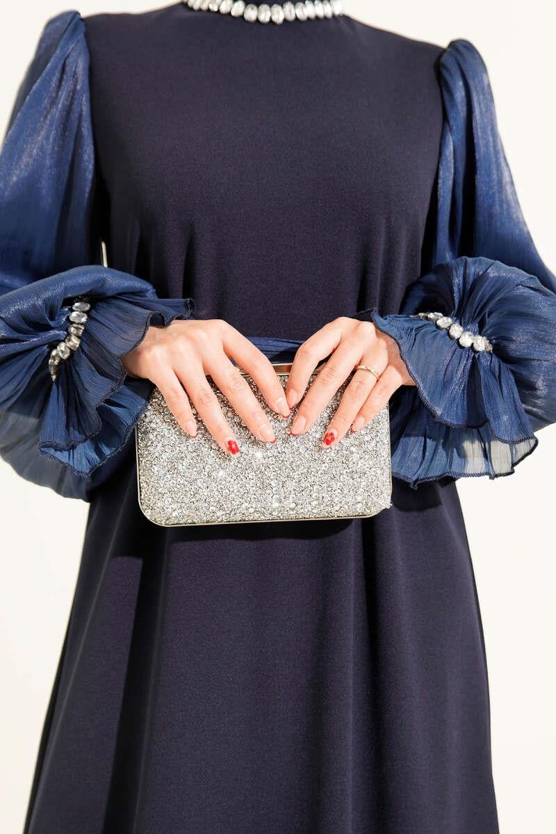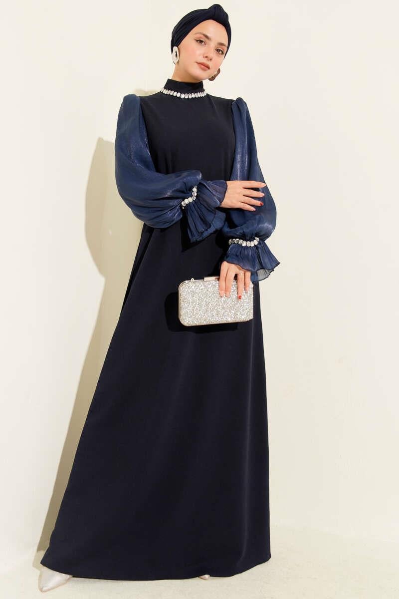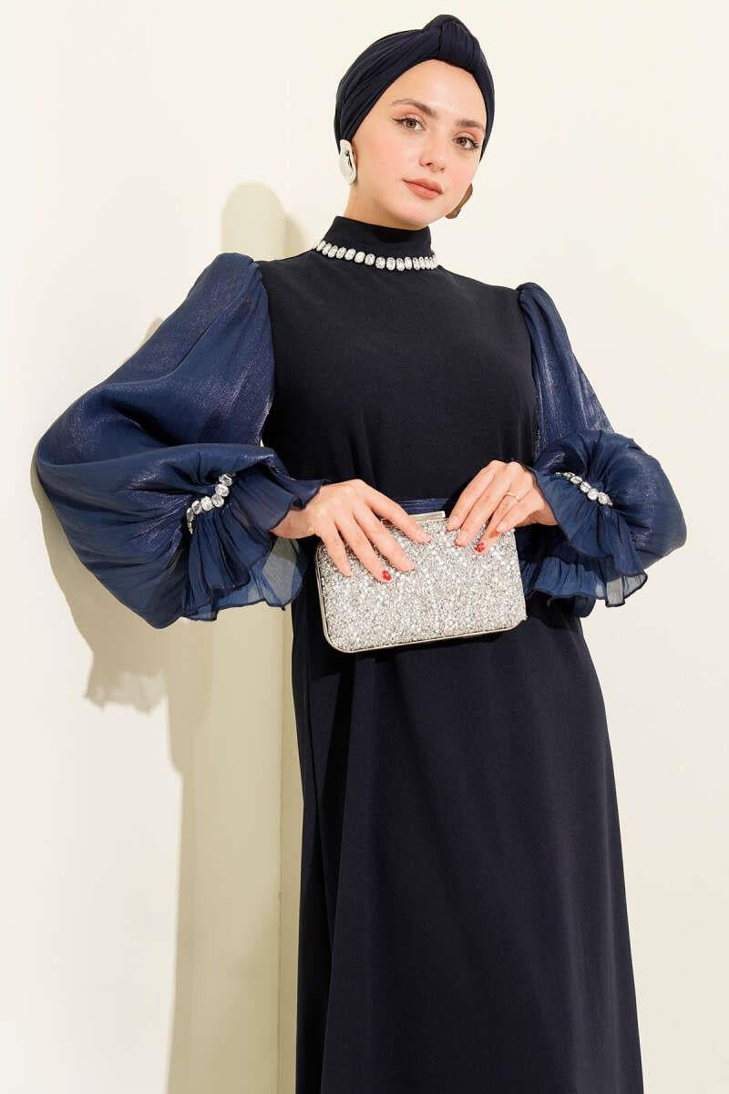 Pearl Detailed Belted Evening Dress Navy Blue (8163-4443-674915)