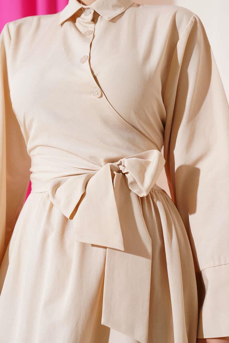 Side Tie Half Cross Button Dress Beige (8089-265-642758)