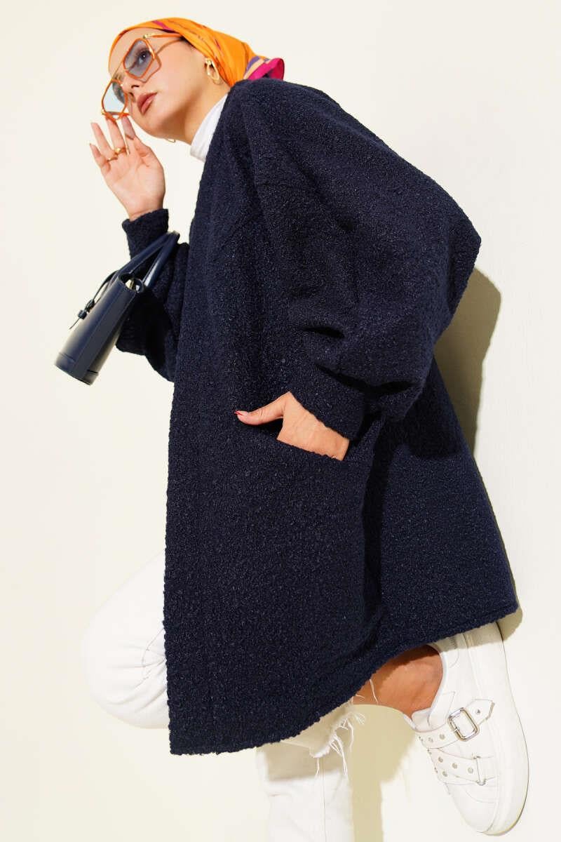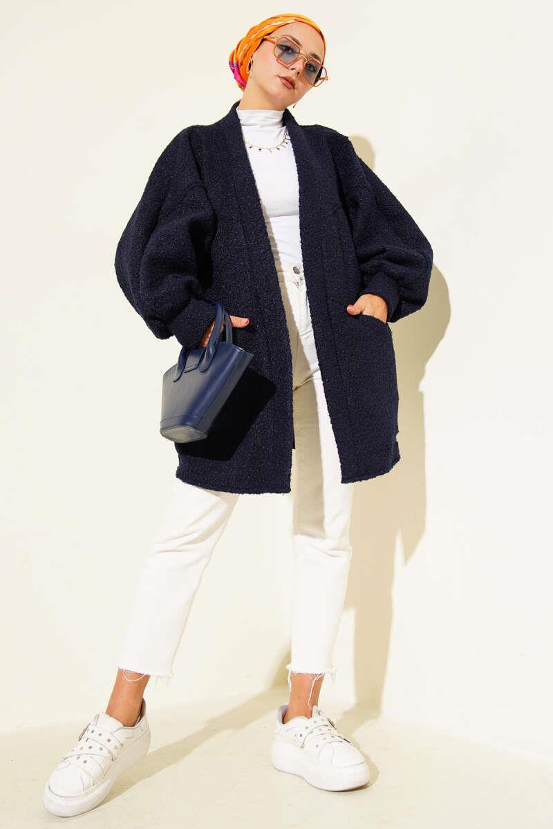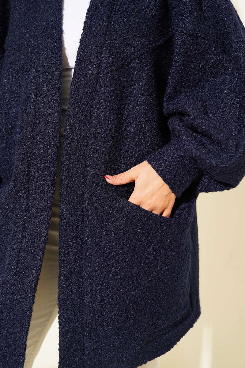 Batwing Sleeve Belted Boucle Jacket Navy Blue (0582-12957-677018)
