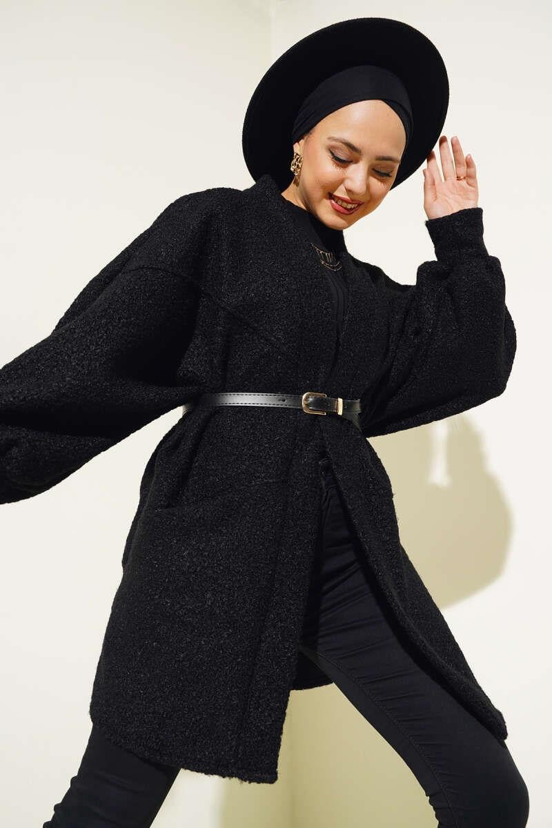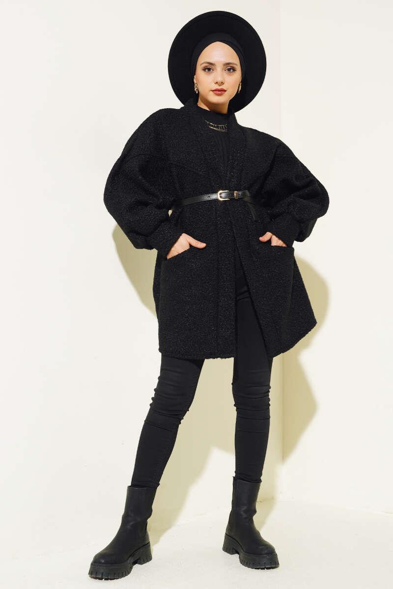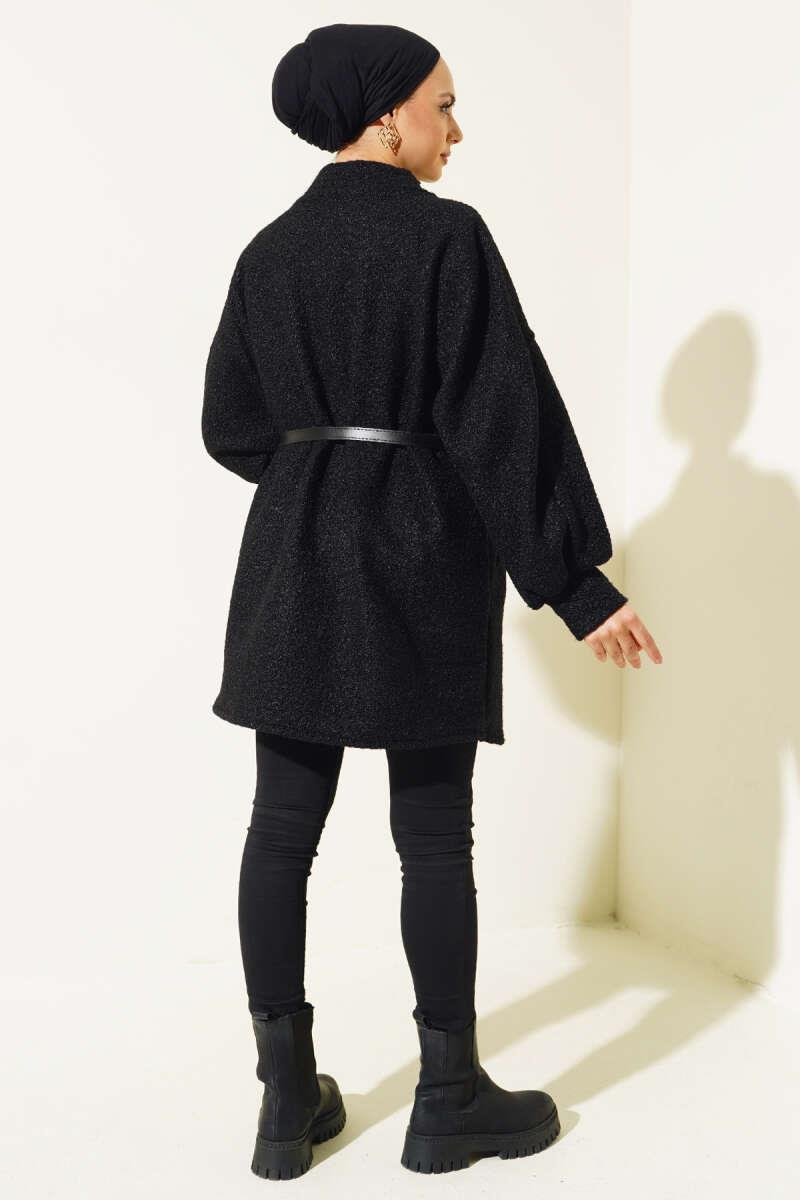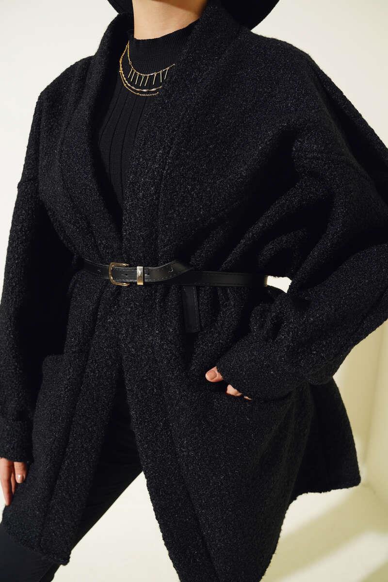 Batwing Sleeve Belted Boucle Jacket Black (0582-12957-579826)