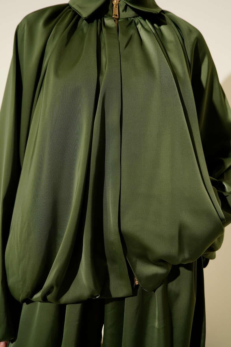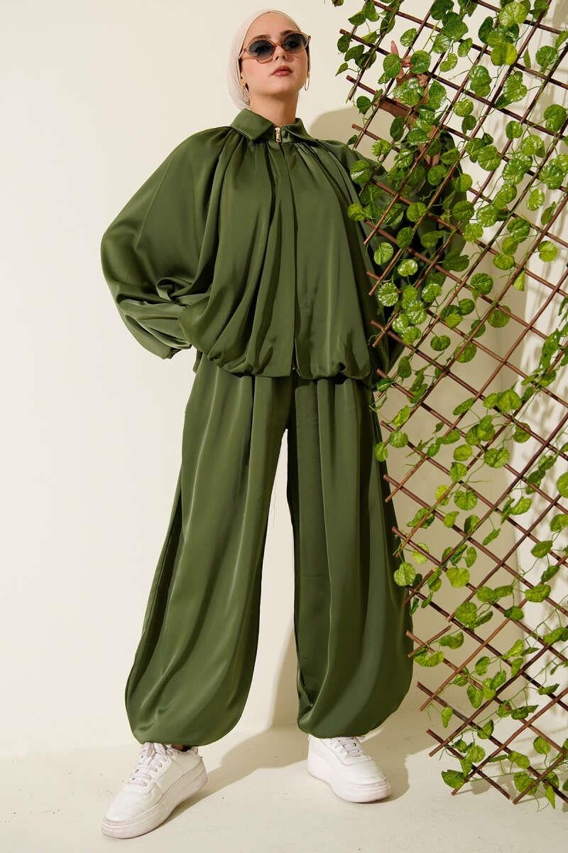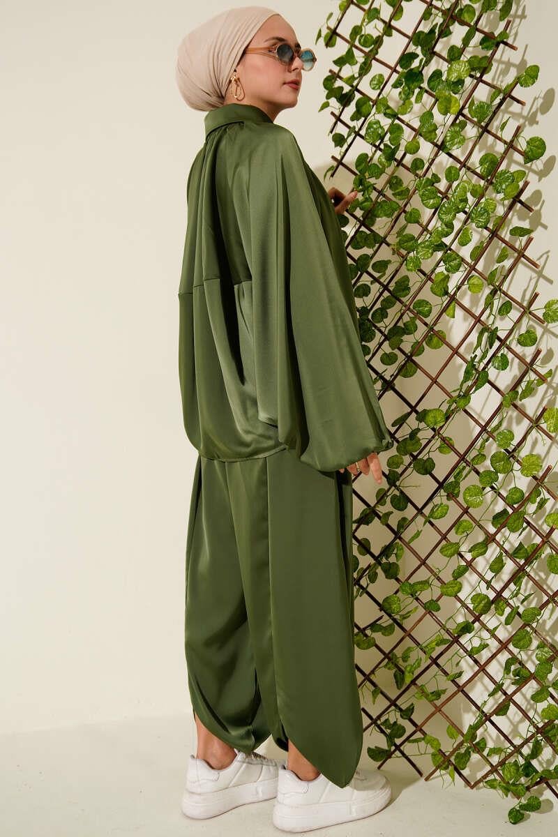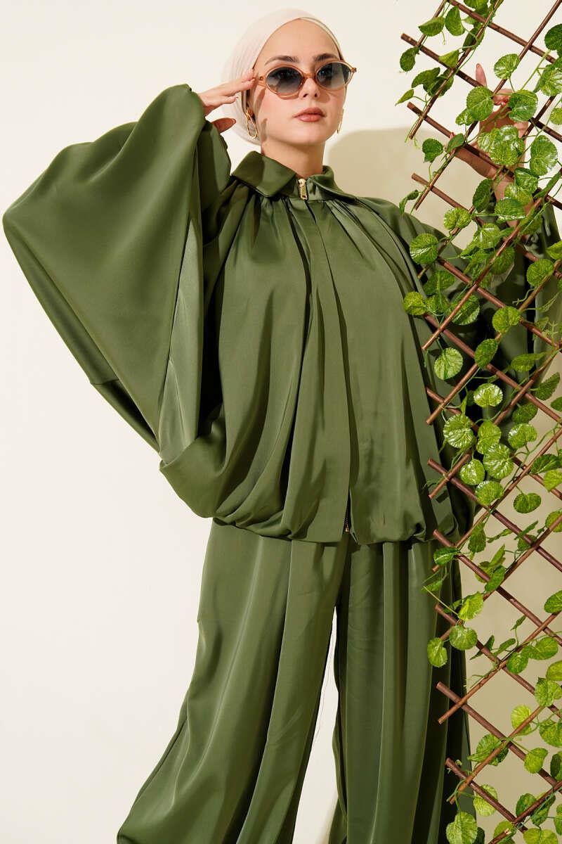 Batwing Sleeve Satin Loose 2 Piece Set Khaki (0853-3015-25-681229)