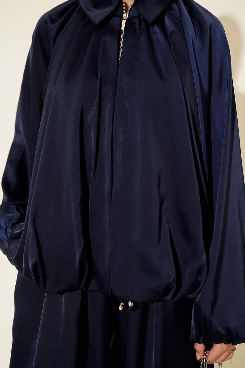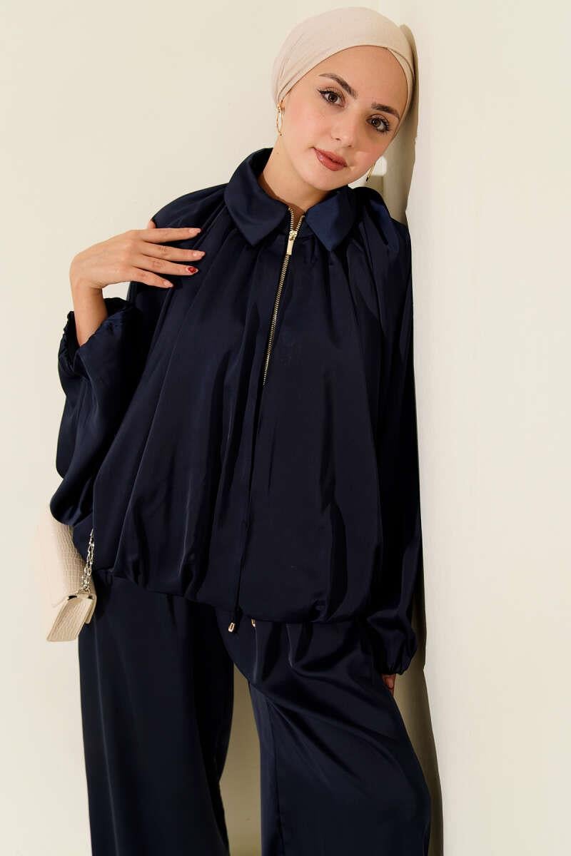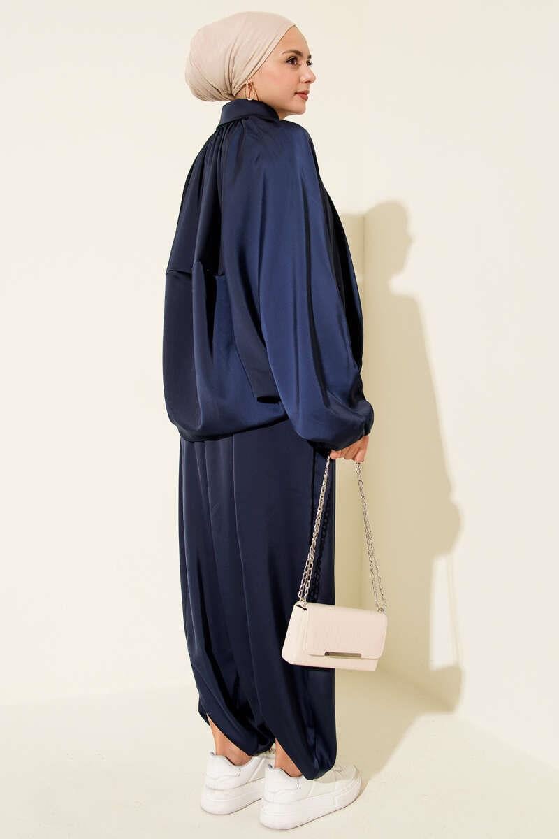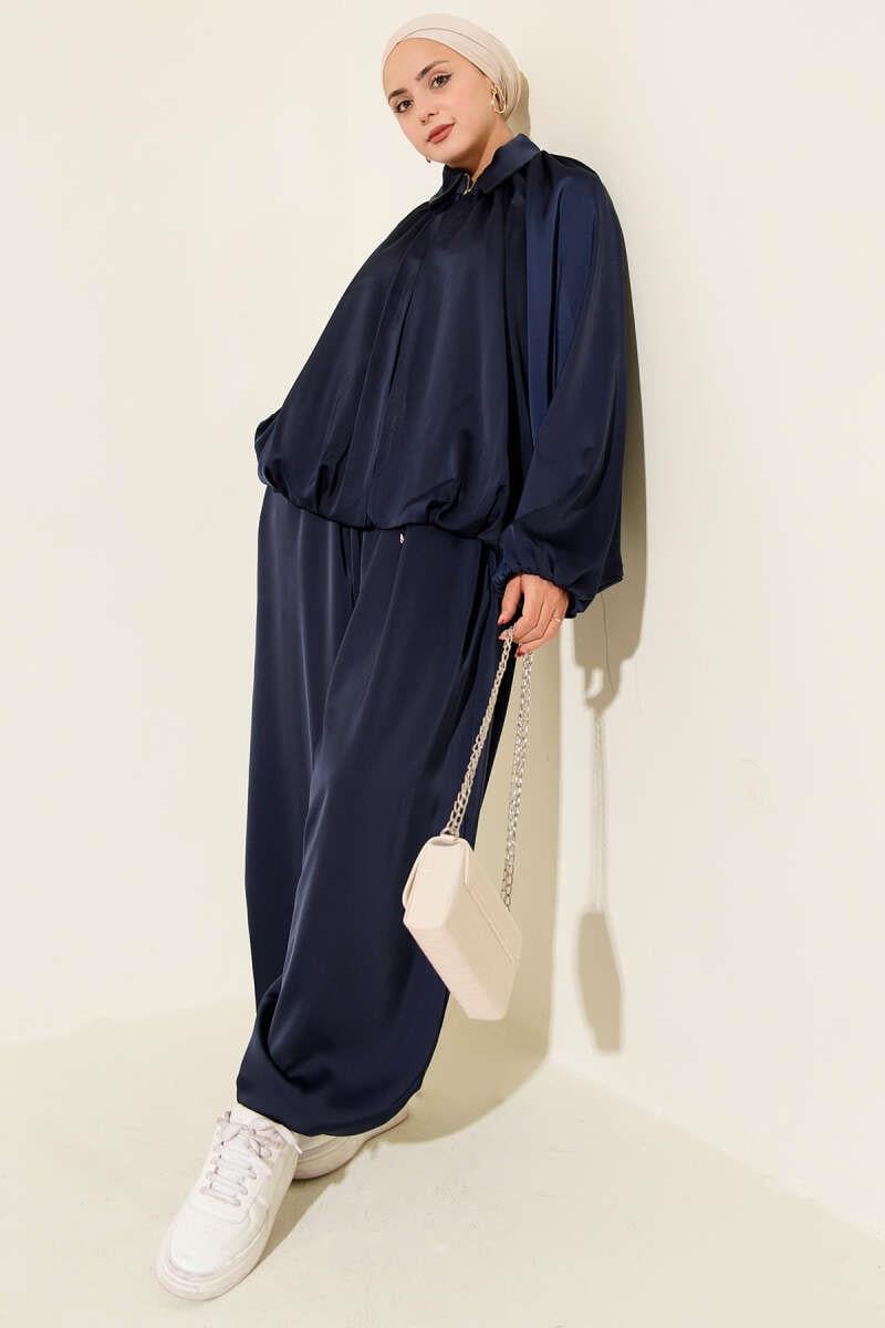 Batwing Sleeve Satin Loose 2 Piece Set Navy Blue (0853-3015-25-681233)