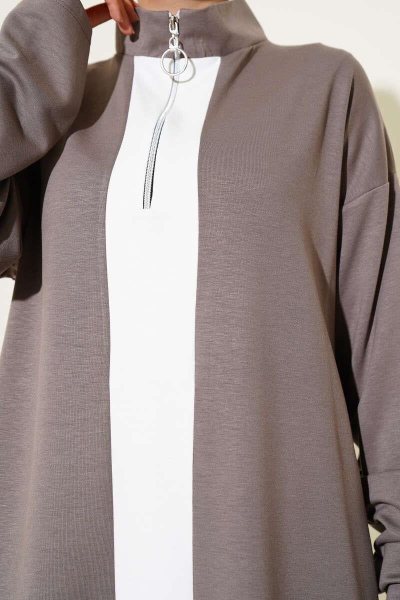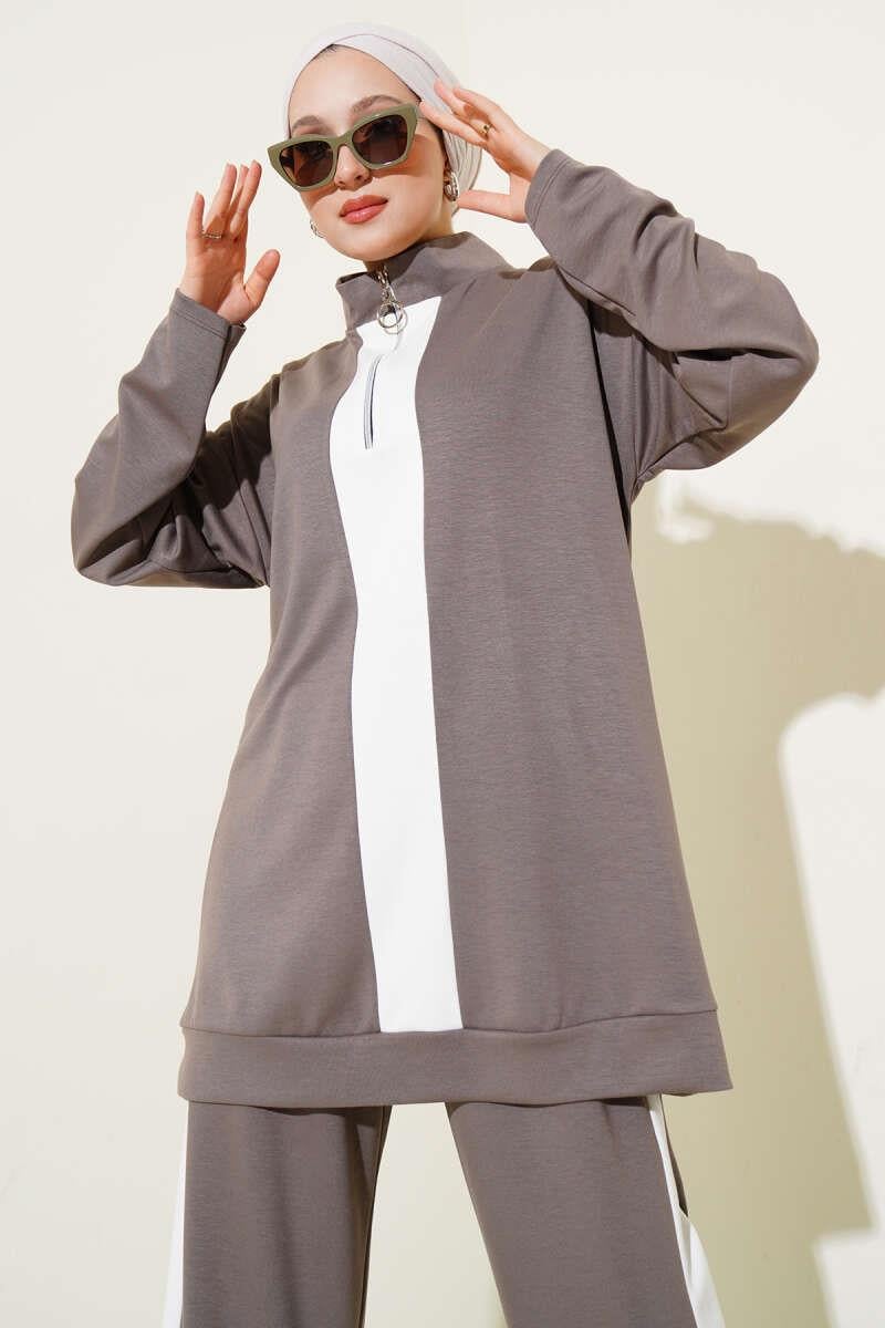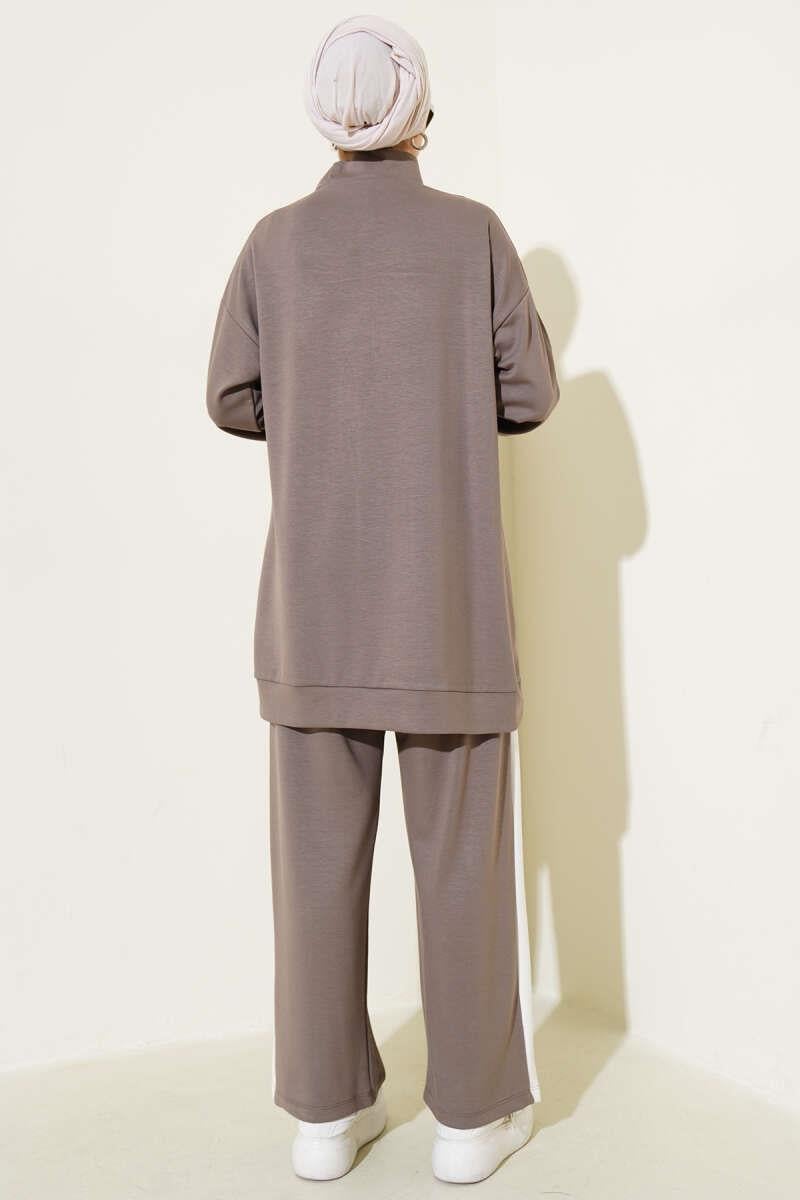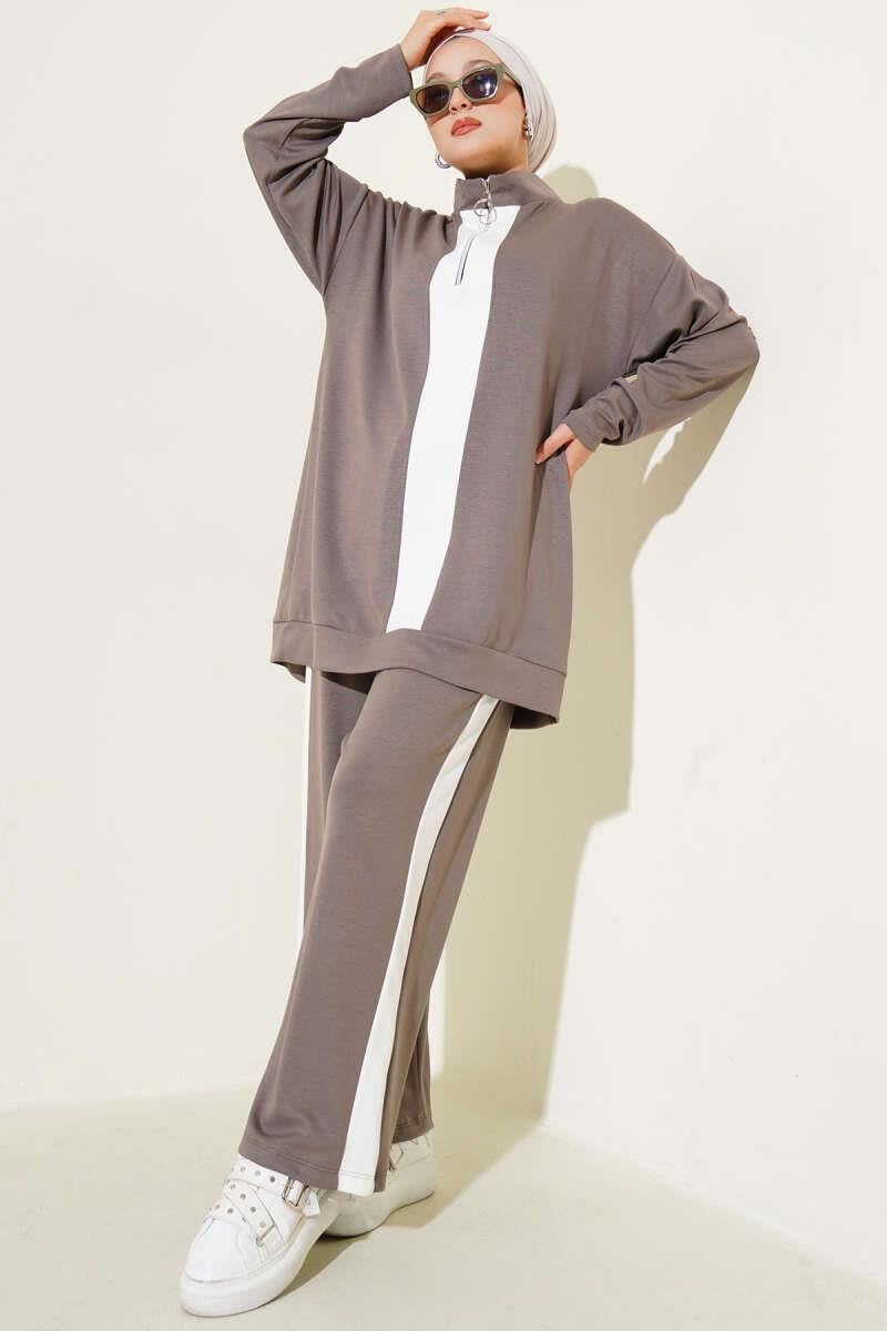 Half Zippered Loysha Striped 2 Piece Set Mink (0829-5303-666331)