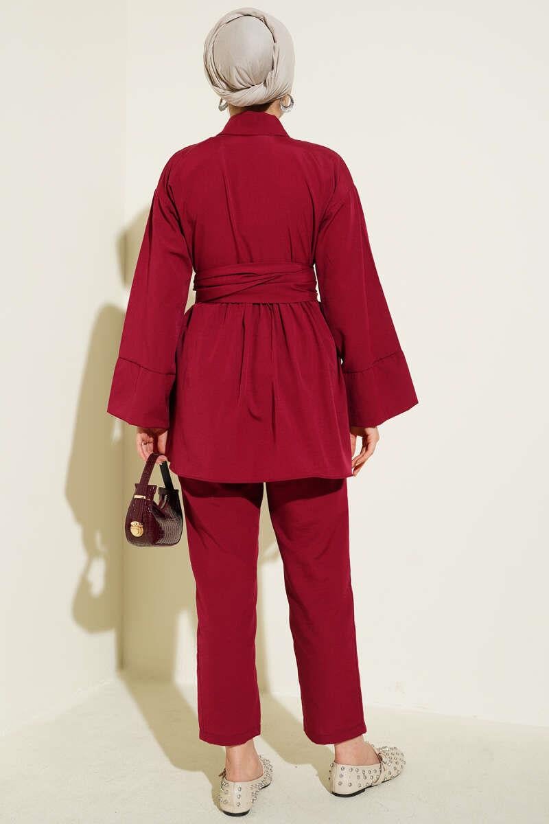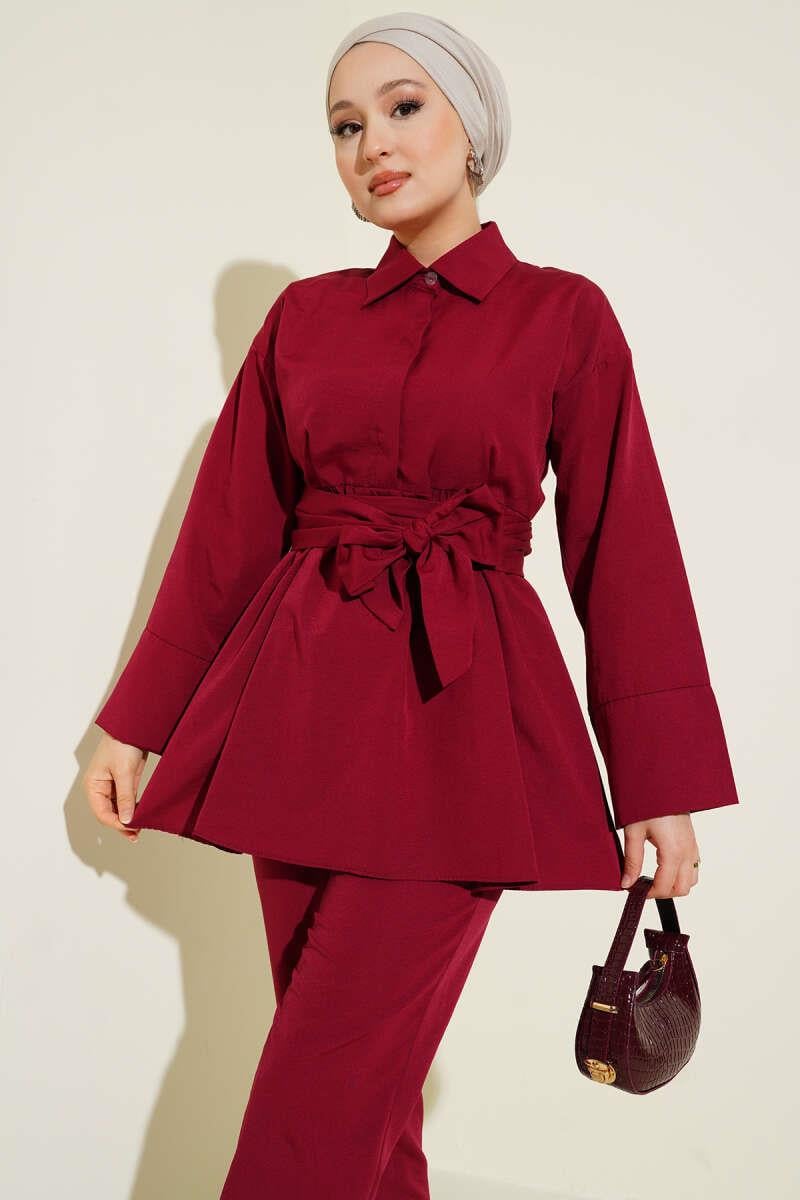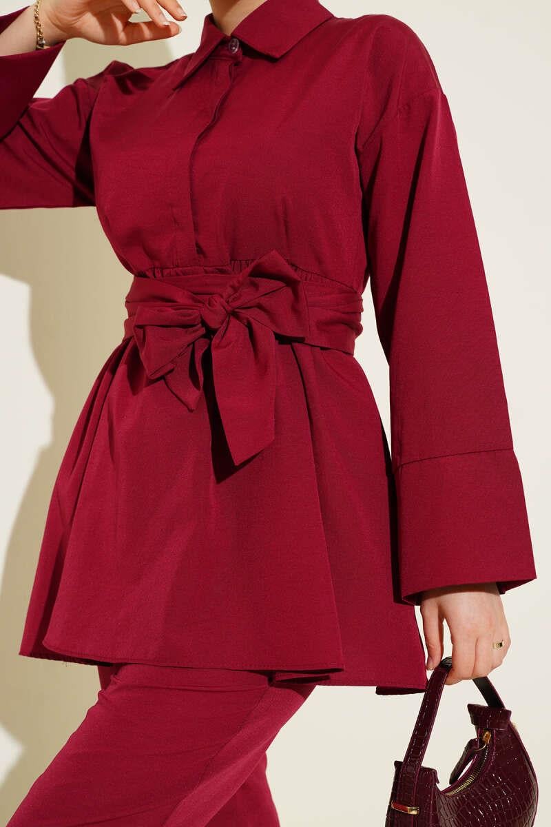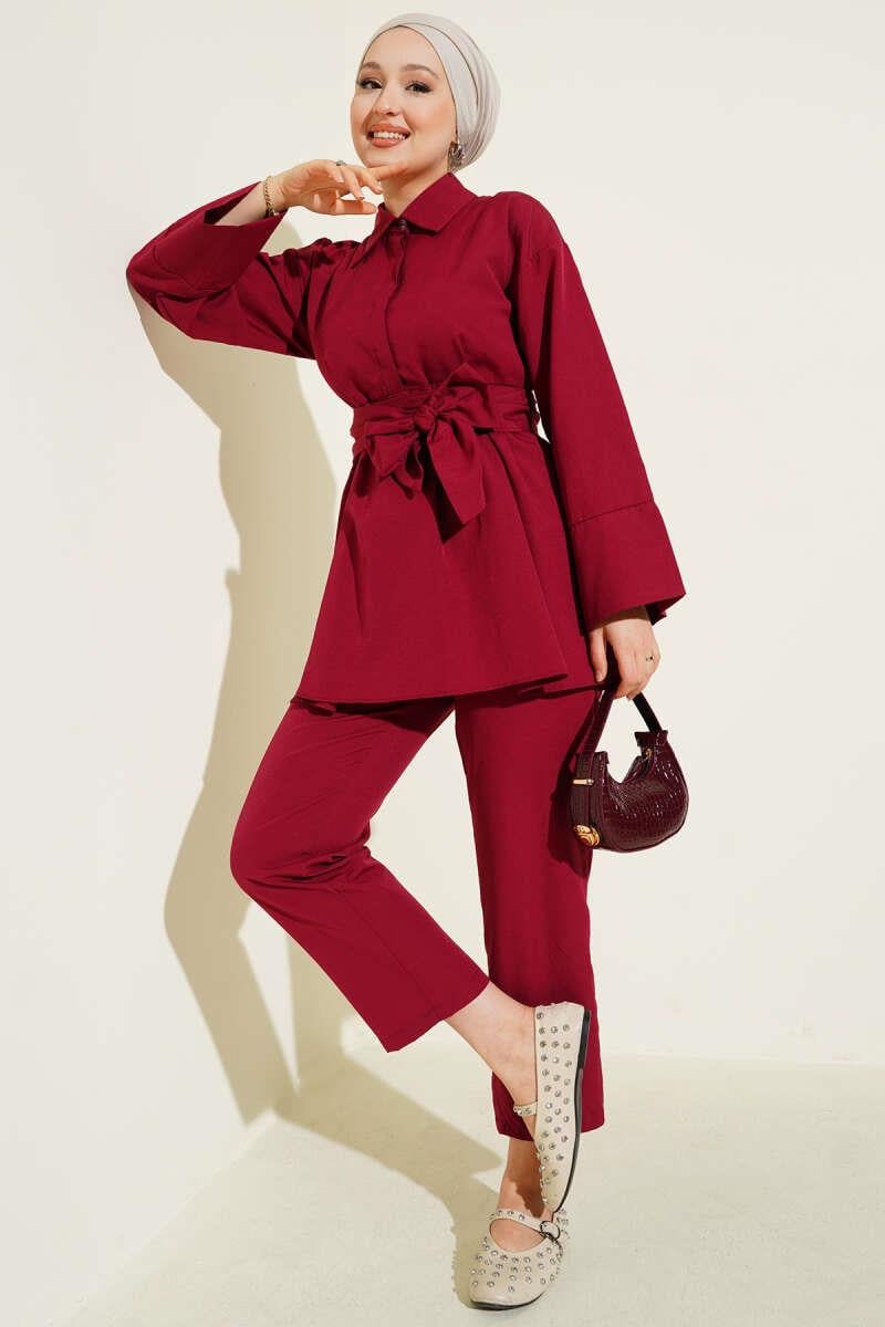 Half Hidden Button Belted 2 Piece Set in Burgundy (8209-1642-664993)