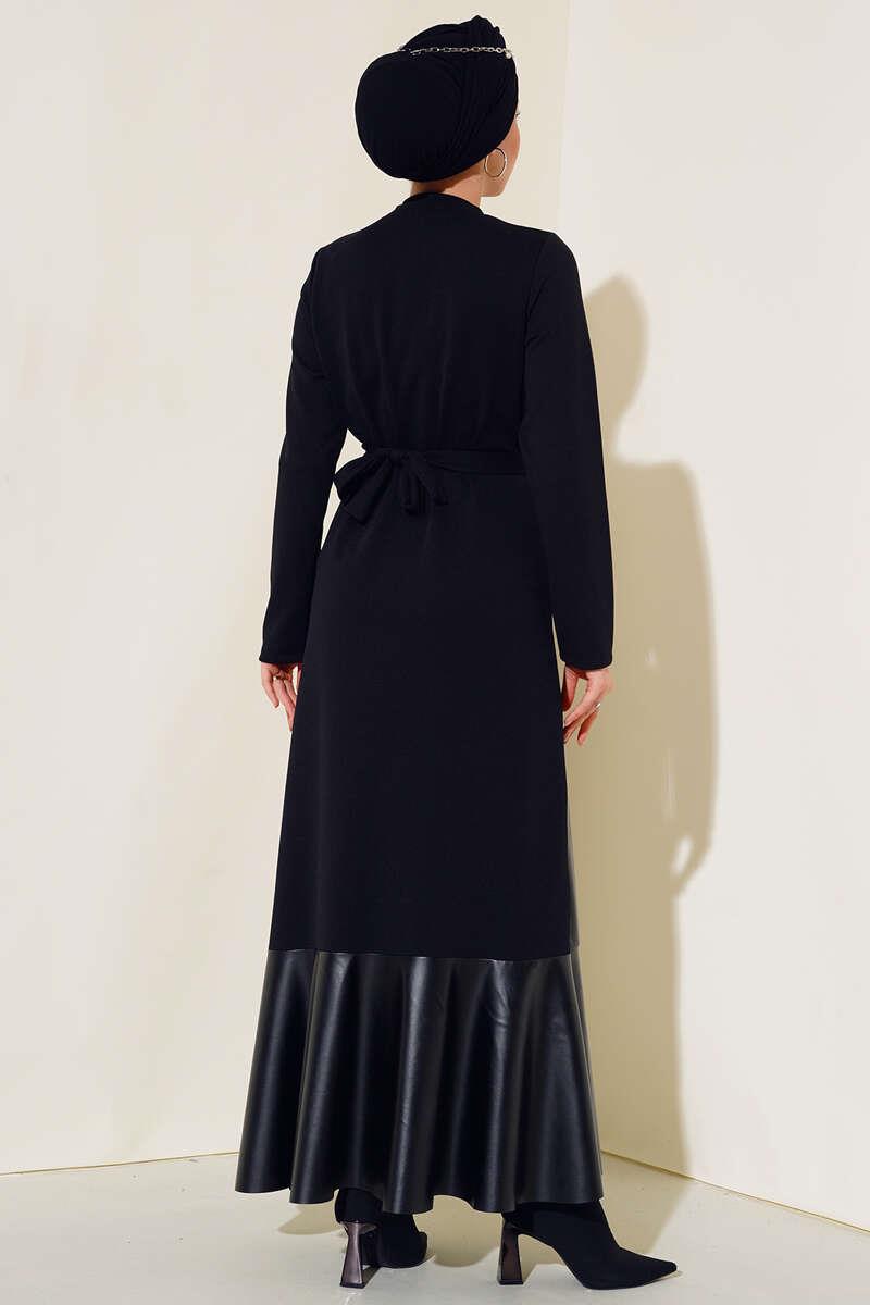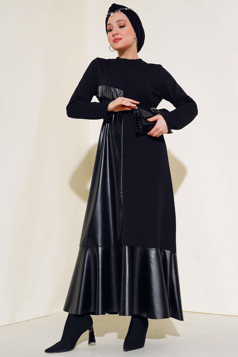 You will love our new season dress model . Our half leather dress is a flared model. It should be tied with a belt at the waist. It has a chest chain detail. The hem is leather. Our stylish dresses are waiting for their place in your wardrobes.