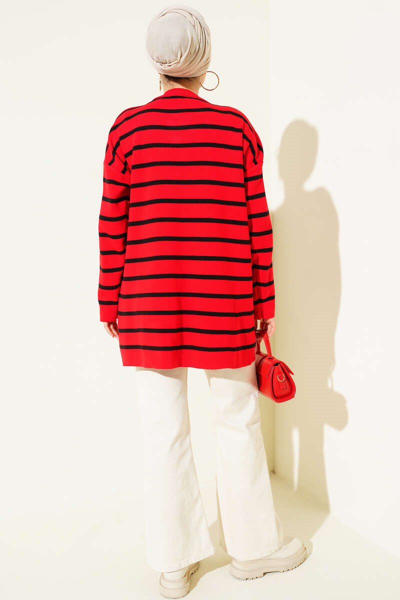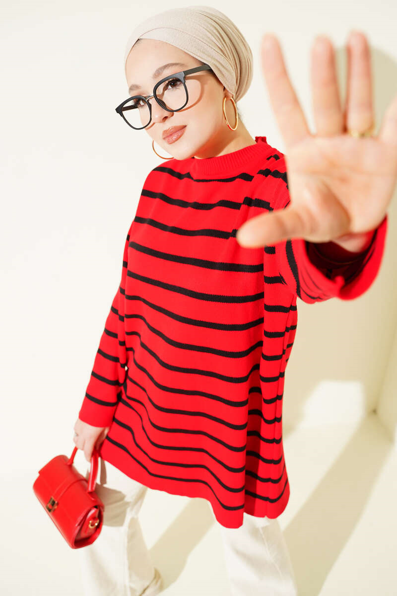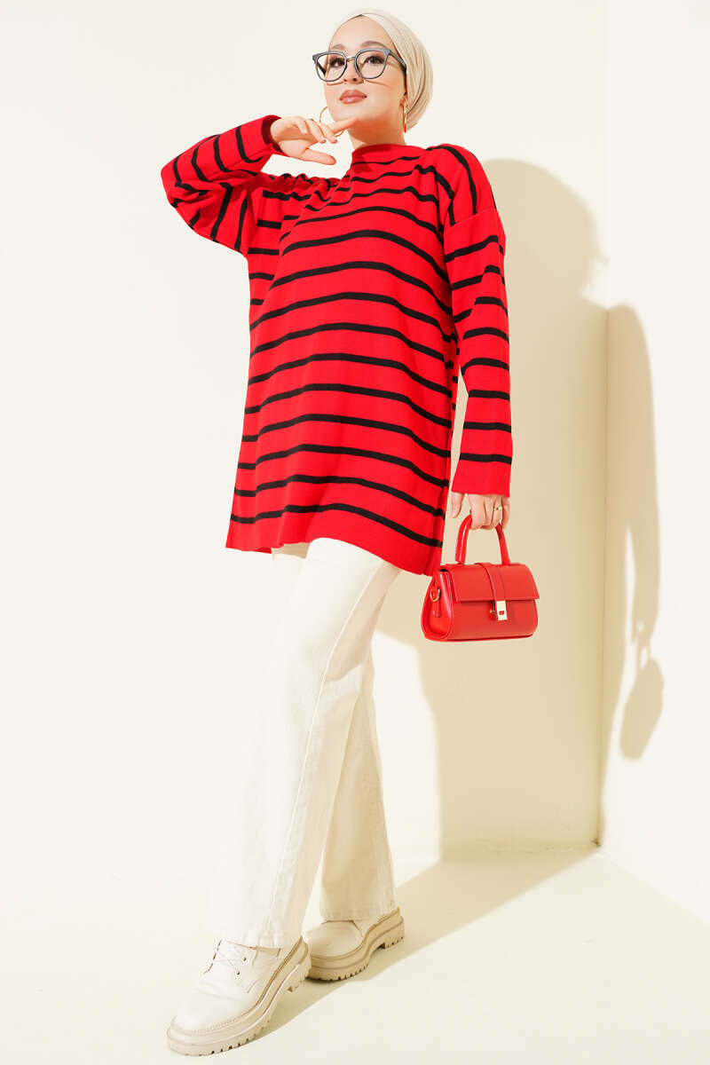 Horizontal Stripe Detail Basic Knit Tunic Red