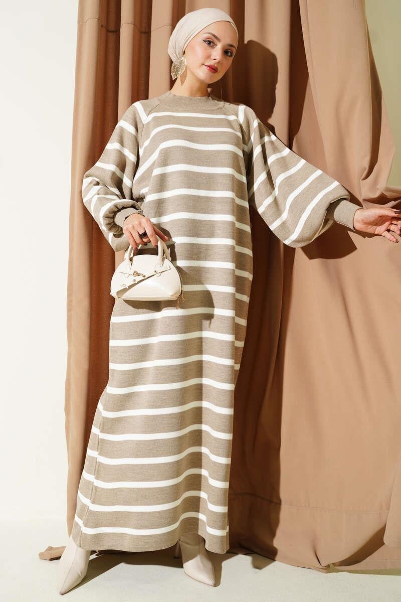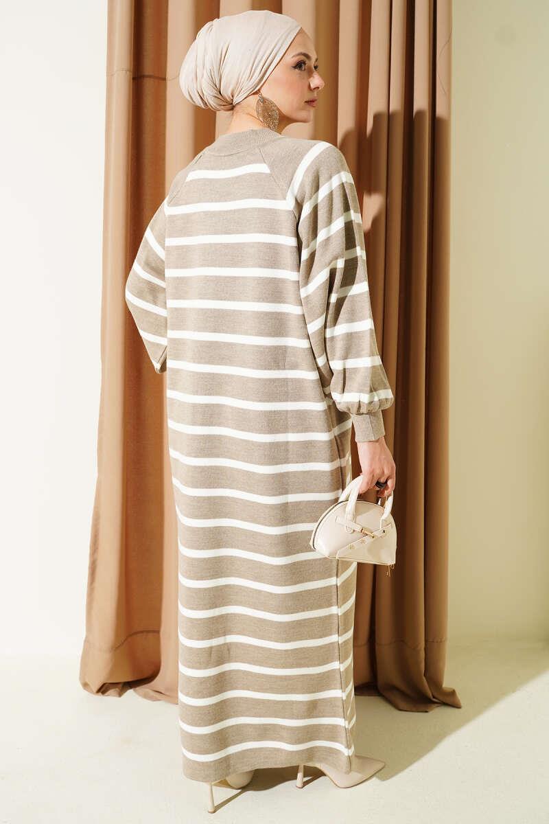 Horizontal Striped Basic Knit Dress, Mink (0875-7060-695820)