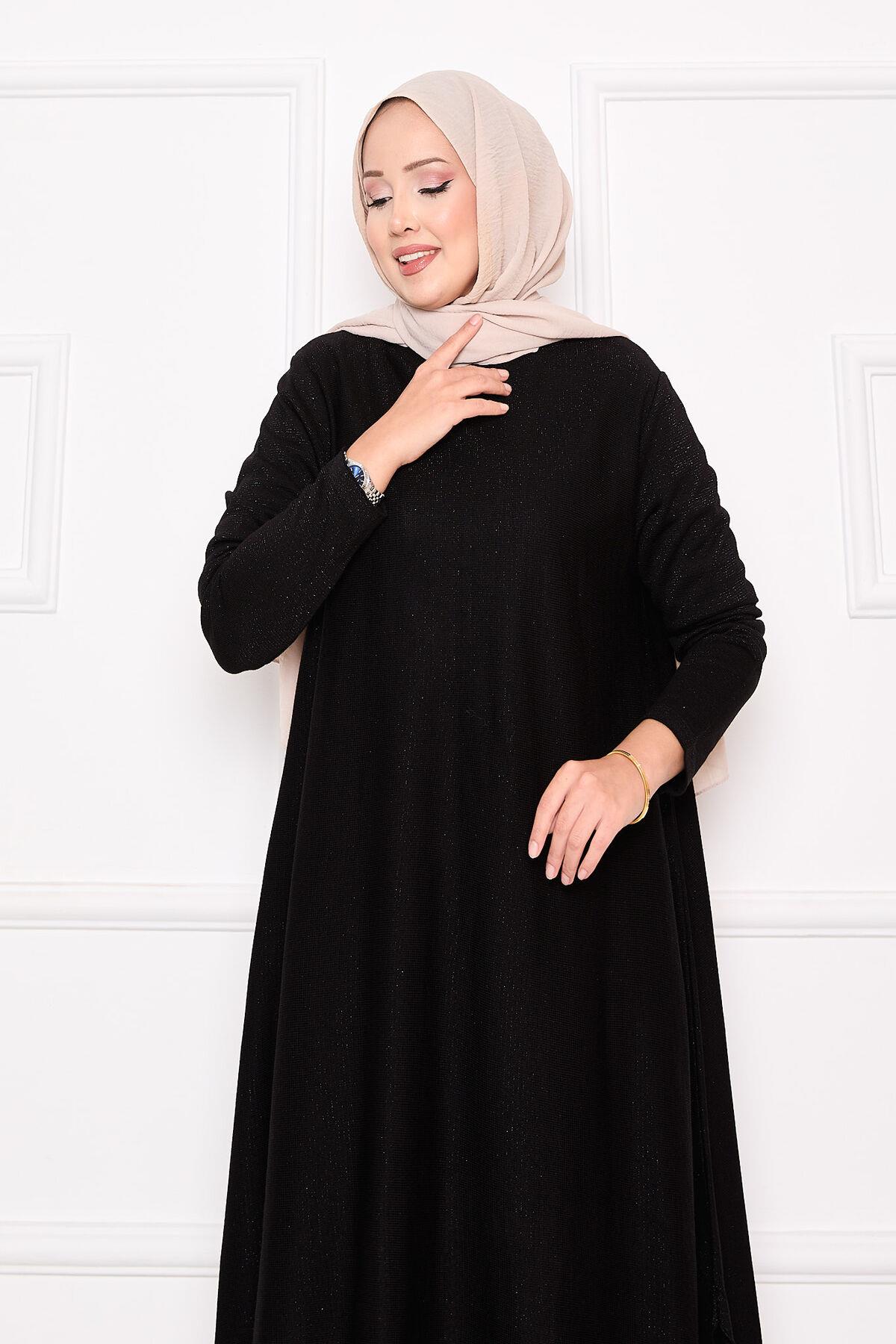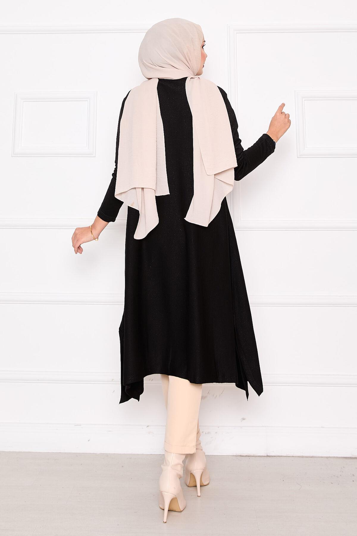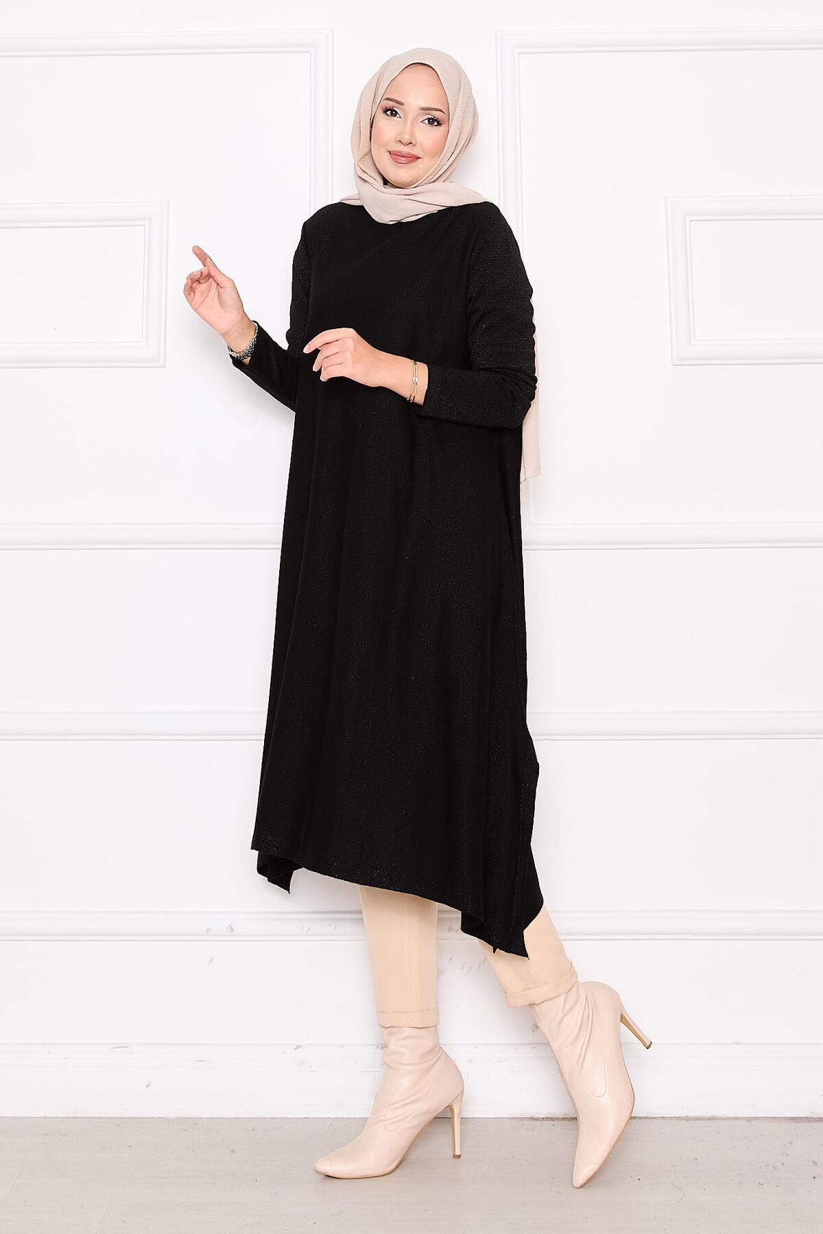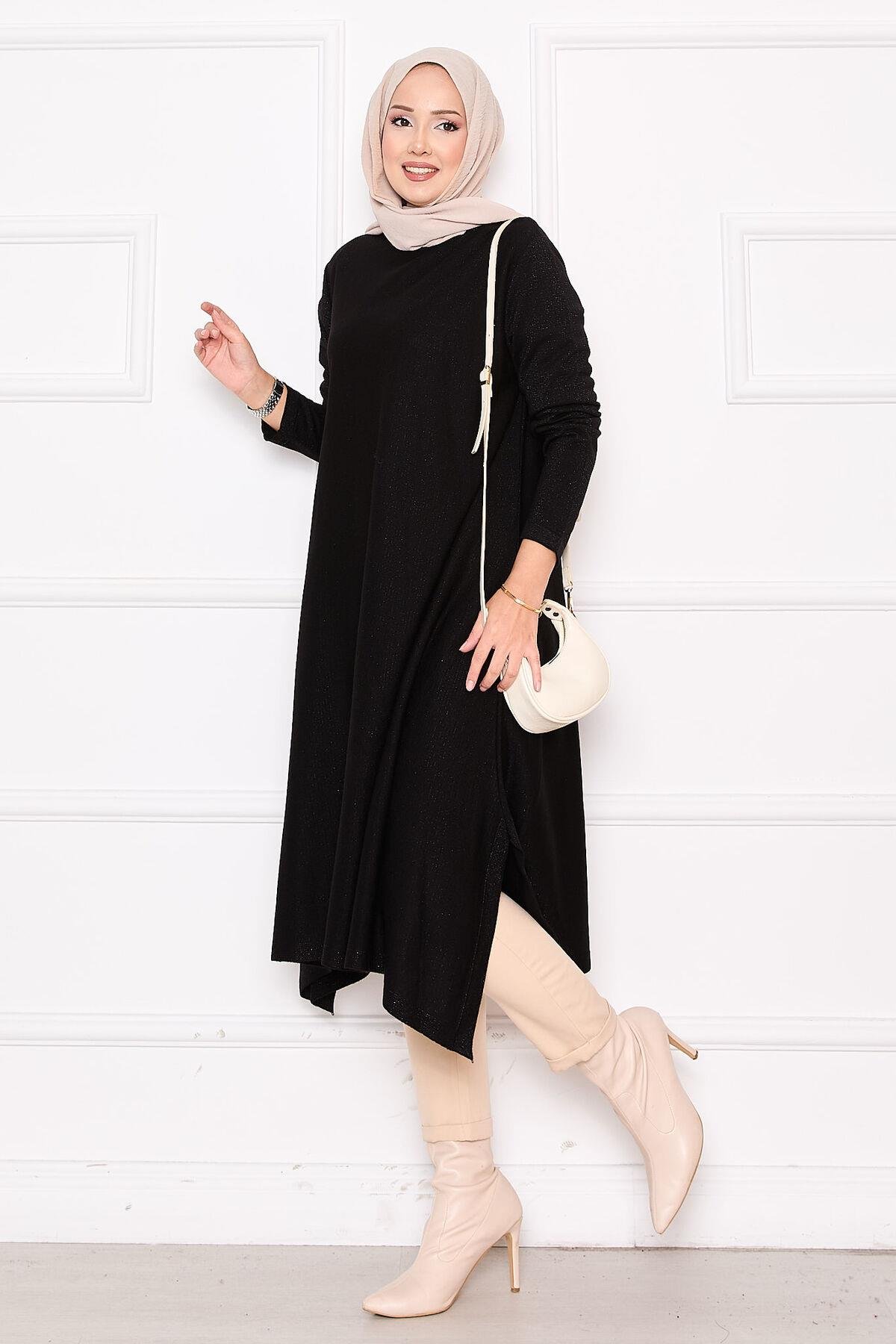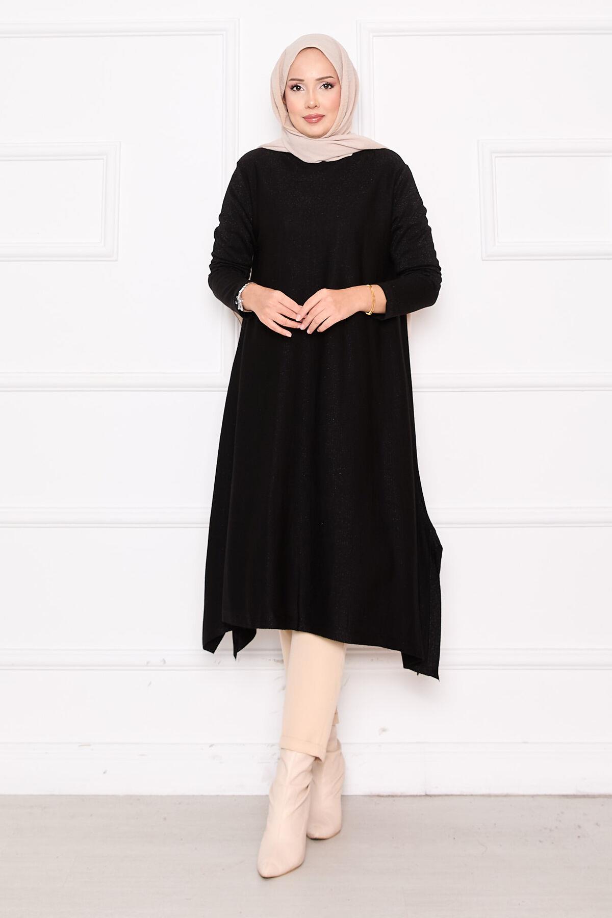 Slit Detailed Glittery Mevlana Knit Tunic Black (125M00325640R52STD)