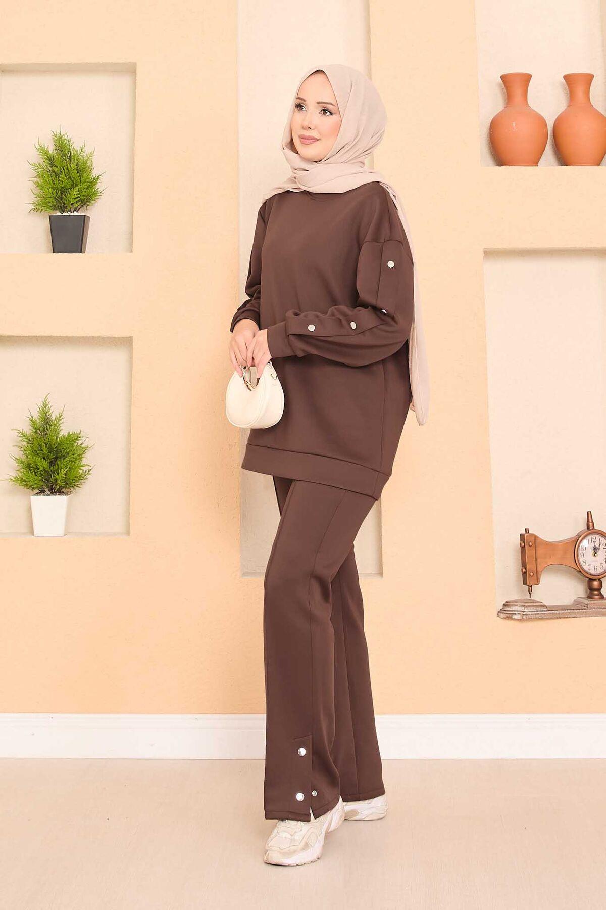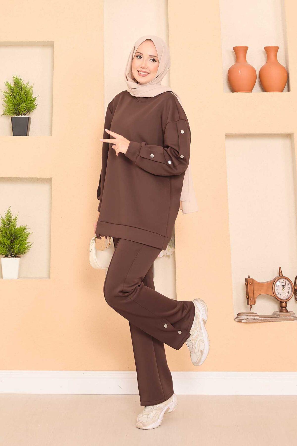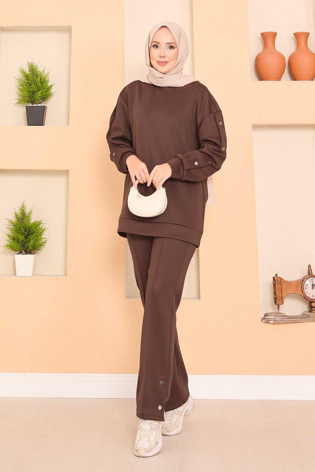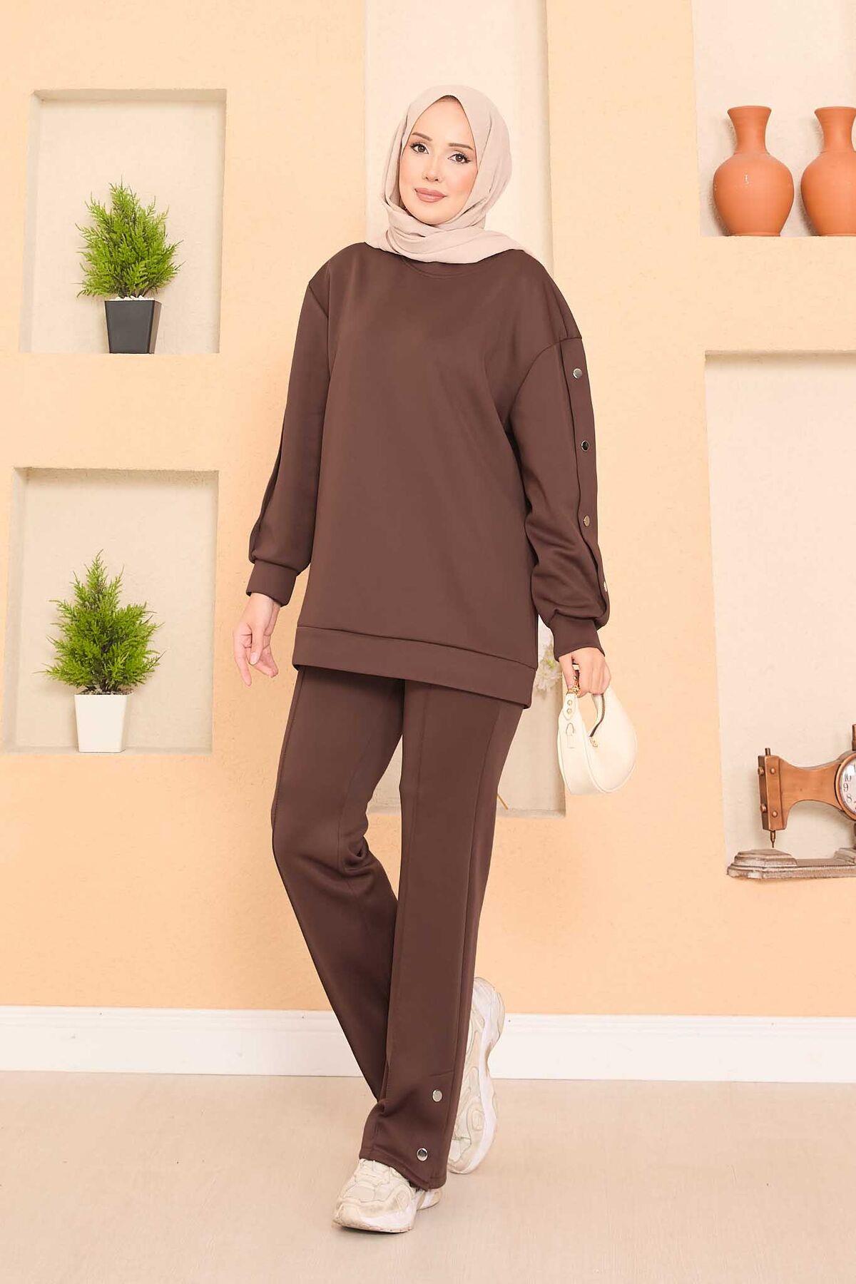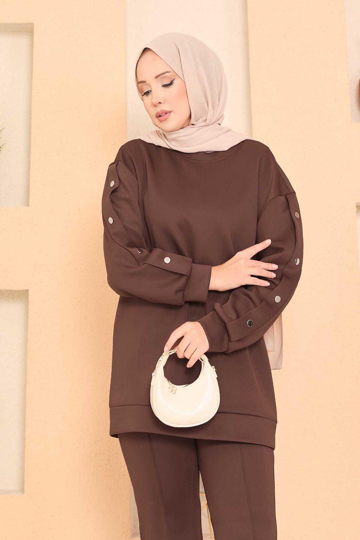 Slit and Snap Detailed Hijab 2 Piece Set Brown (125M00615689R2538)