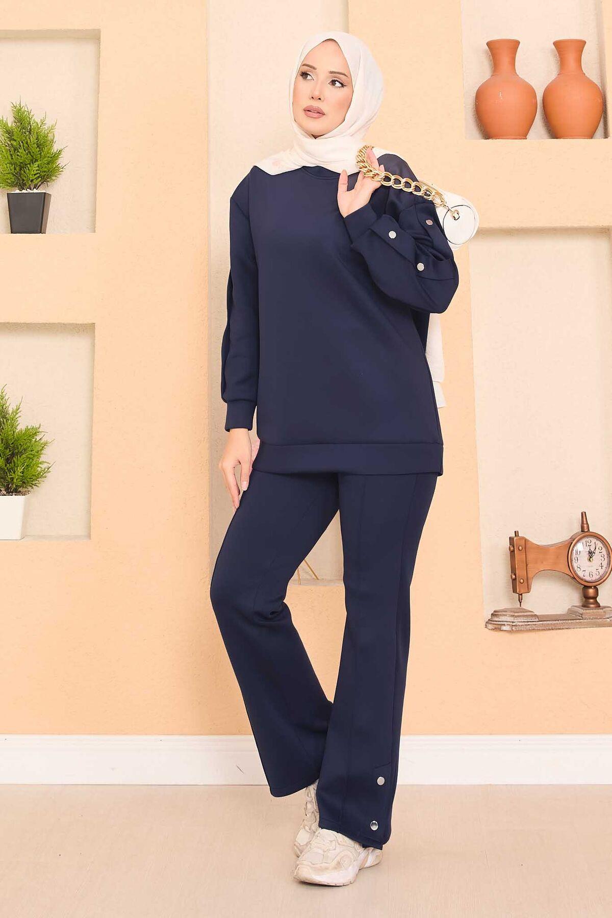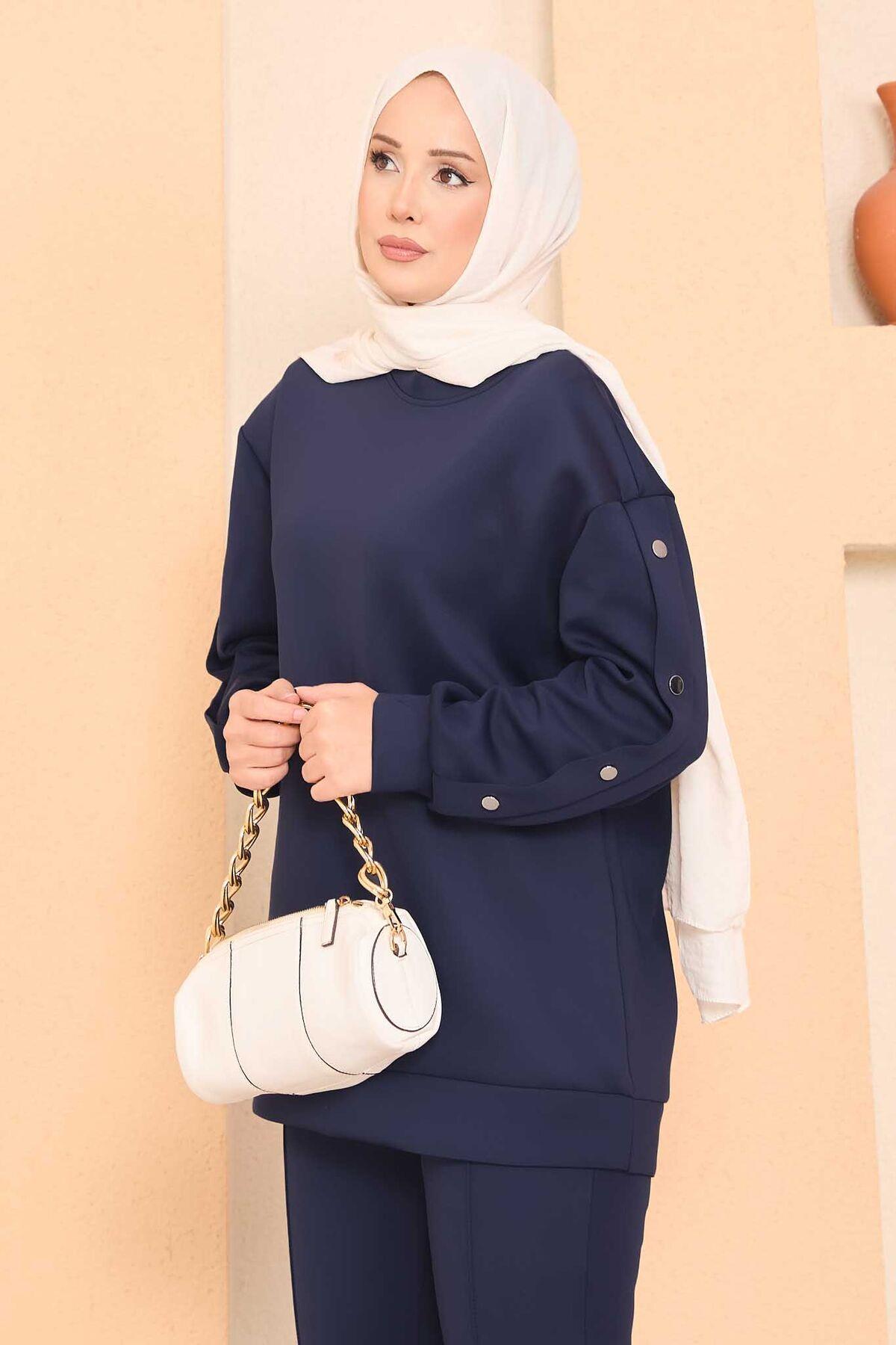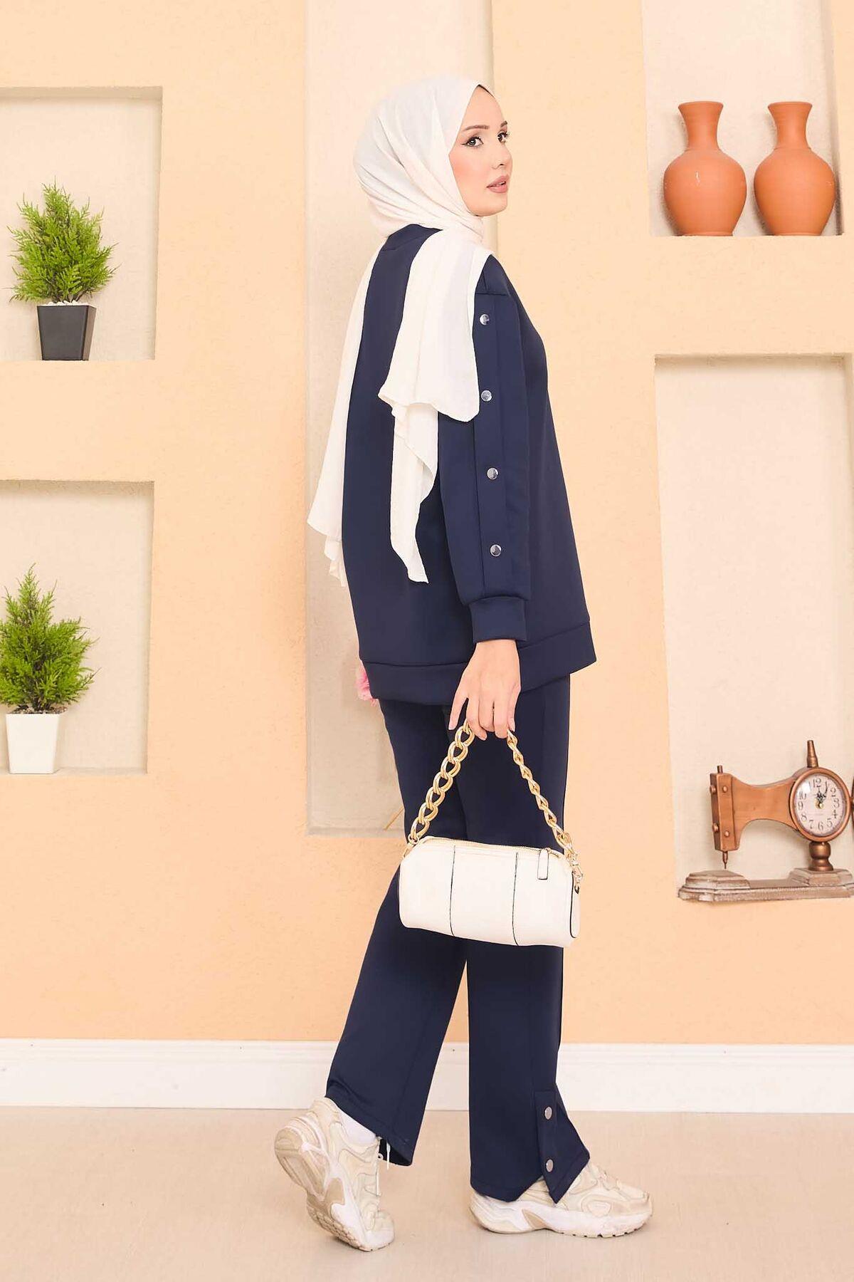 Slit and Snap Detailed Hijab 2 Piece Set Navy Blue (125M00615689R3338)