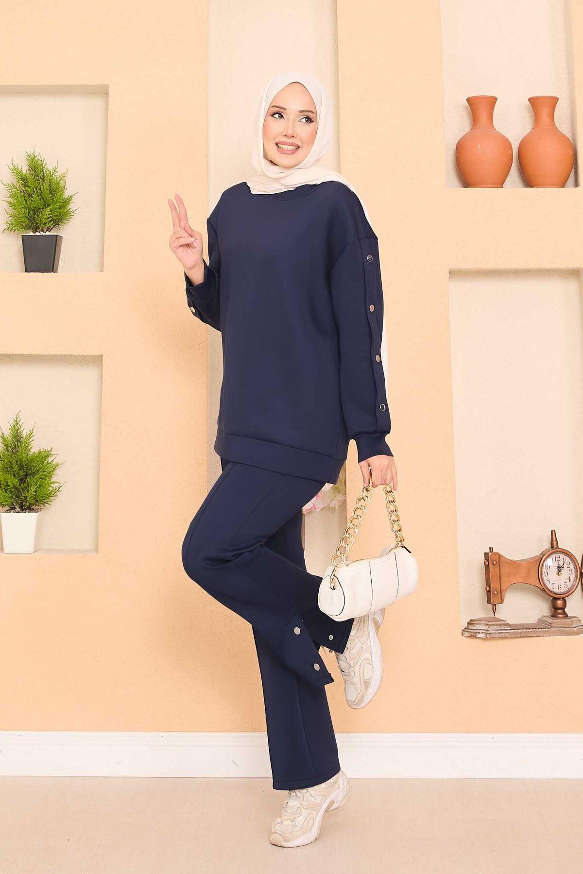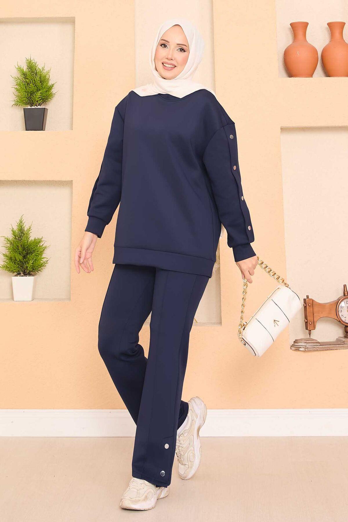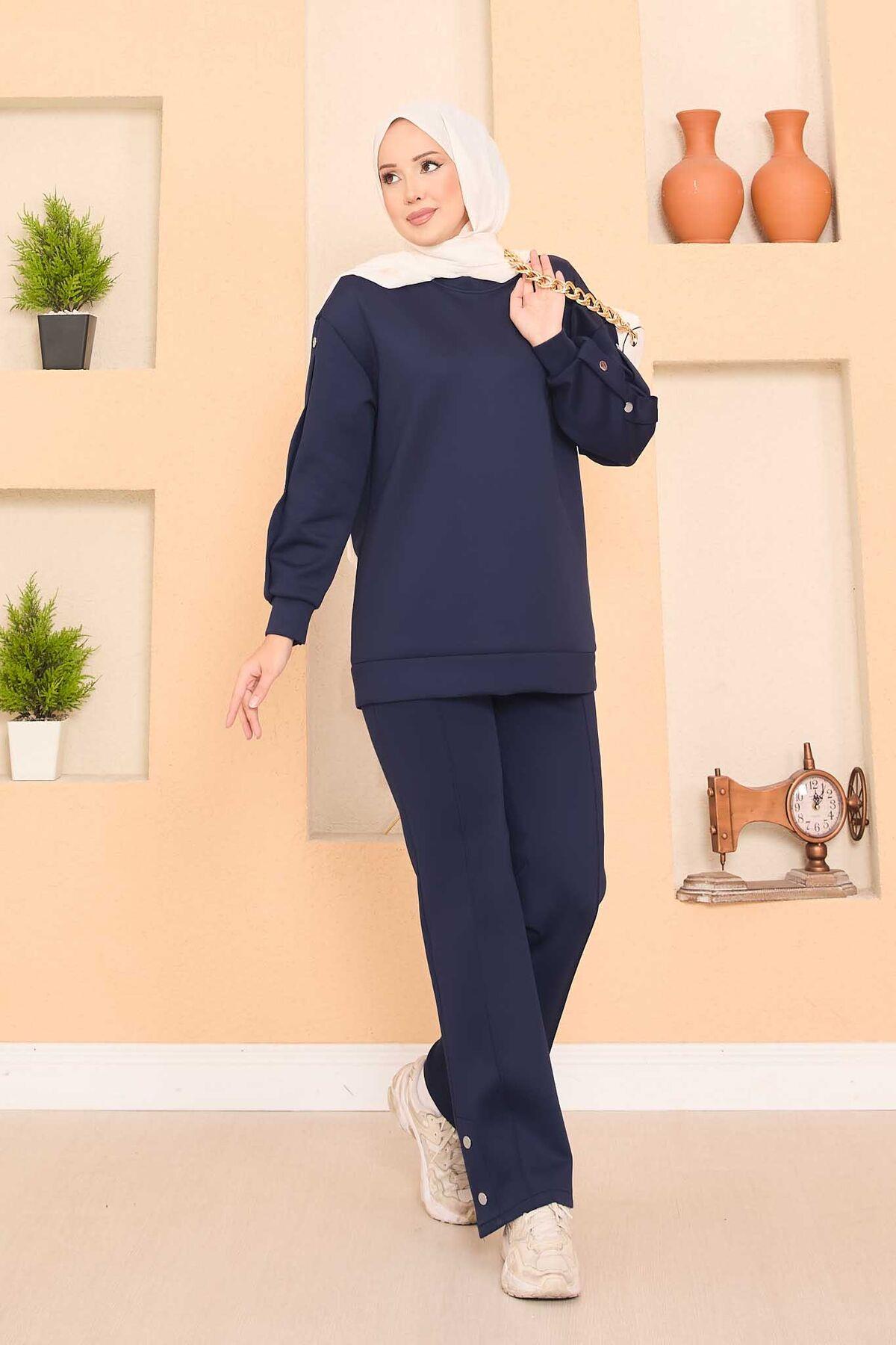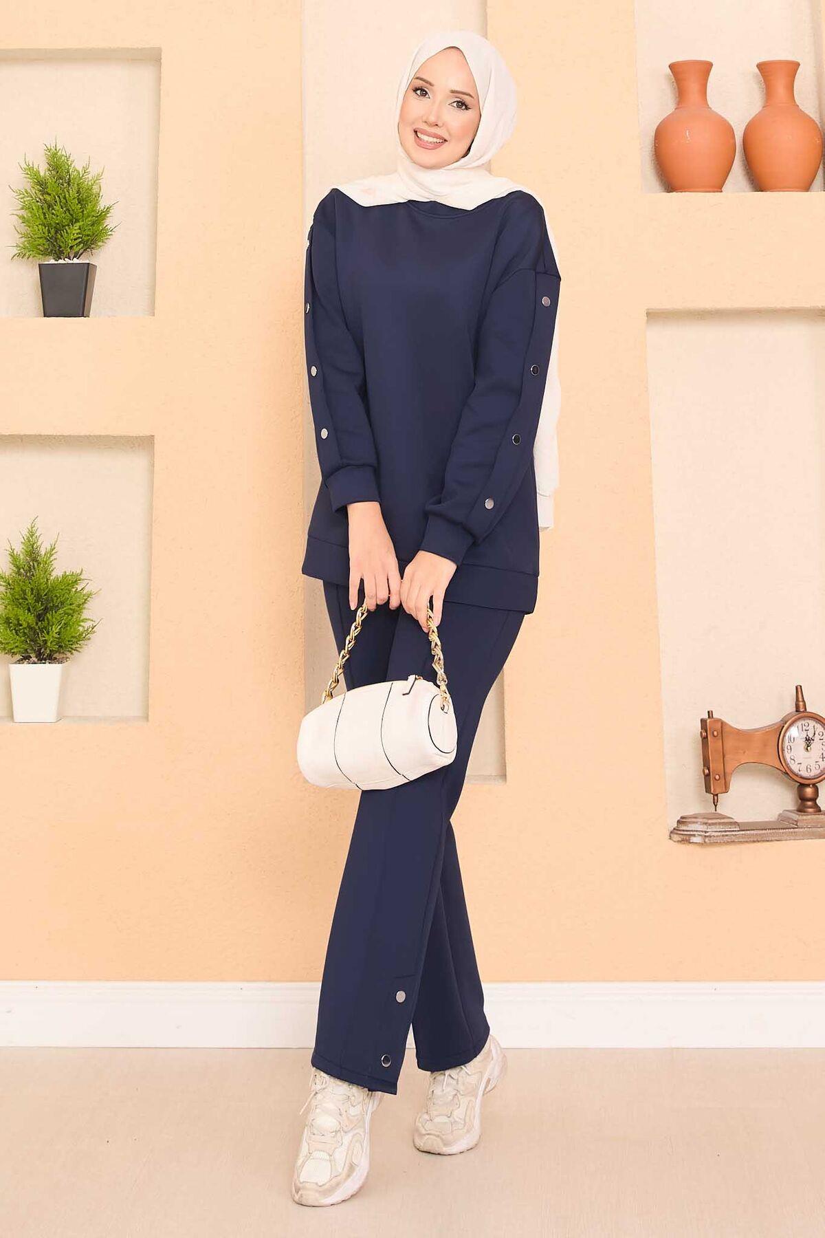 Slit and Snap Detailed Hijab 2 Piece Set Navy Blue (125M00615689R3338)