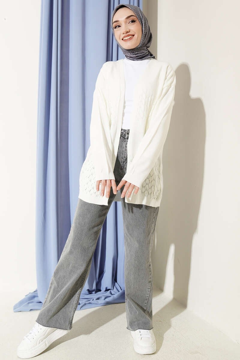 With its elegant zigzag openwork details on the bodice and hem, it combines a classic basic design with a stylish texture. Its buttonless, open front structure offers an ideal option for layering, while its flowing cut provides comfortable range of motion throughout the day. Its lightweight structure and ribbed cuff details help you achieve a modern and neat look in both your daily and office outfits.