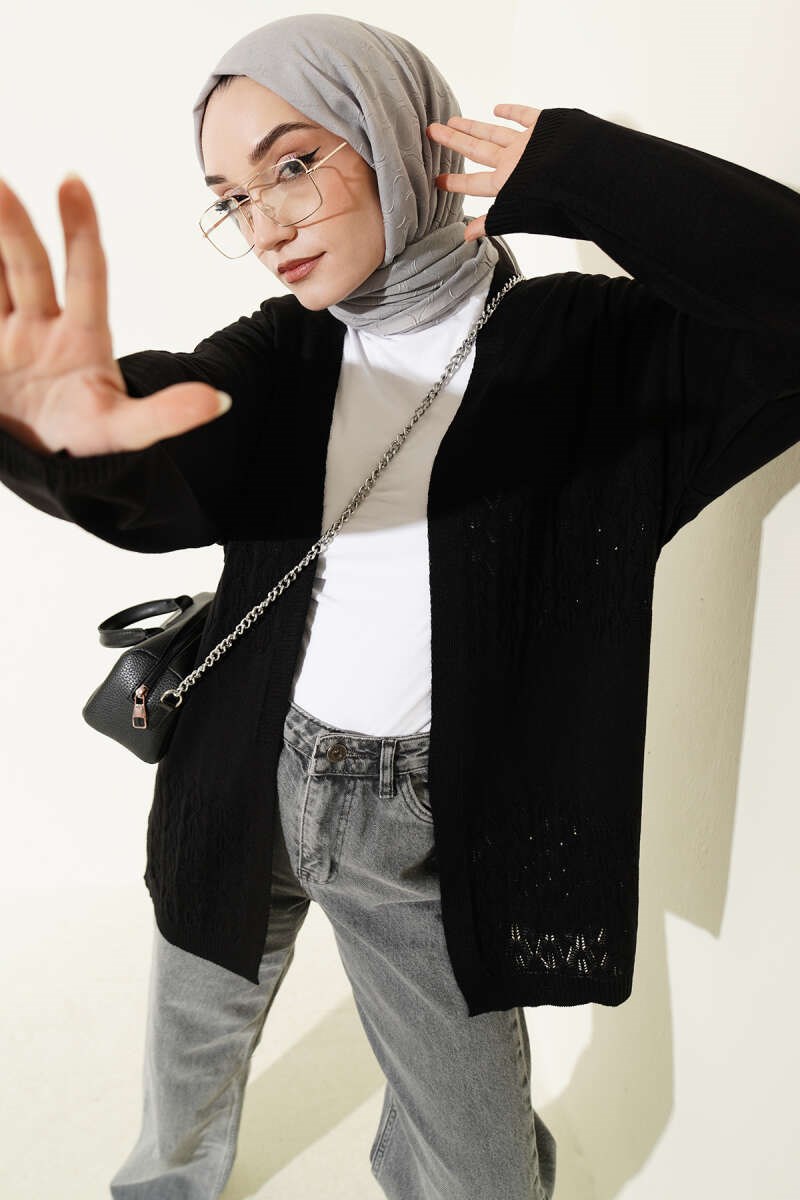 With its elegant zigzag openwork details on the bodice and hem, it combines a classic basic design with a stylish texture. Its buttonless, open front structure offers an ideal option for layering, while its flowing cut provides comfortable range of motion throughout the day. Its lightweight structure and ribbed cuff details help you achieve a modern and neat look in both your daily and office outfits.