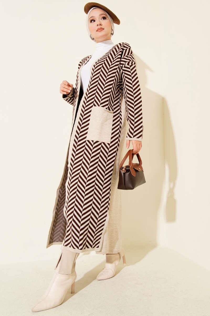 Zigzag Striped Patterned Long Knit Cardigan Beige Brown (0875-7157-671523)
