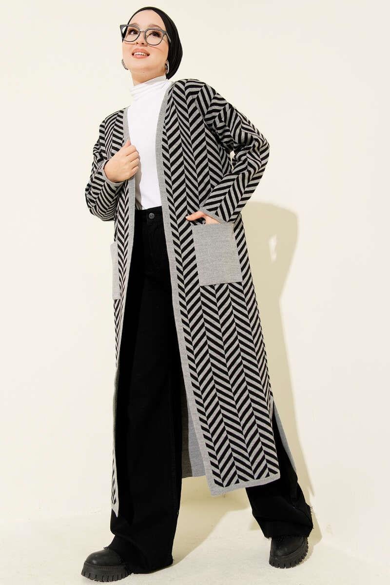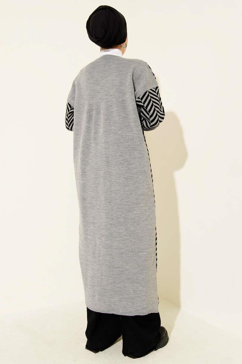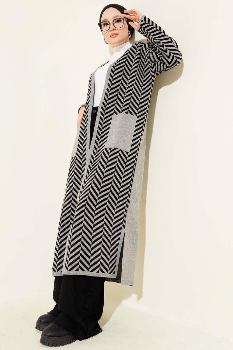 Zigzag Striped Patterned Long Knit Cardigan Gray Black (0875-7157-671525)
