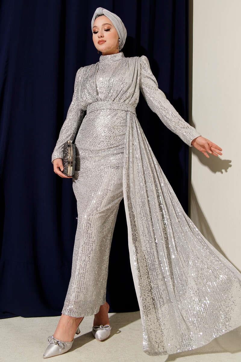 Zippered Sequin Belted Evening Dress Silver (8163-4426-668815)