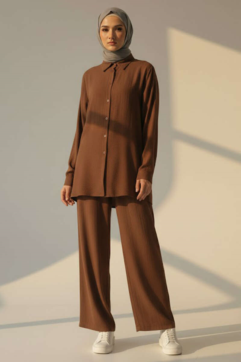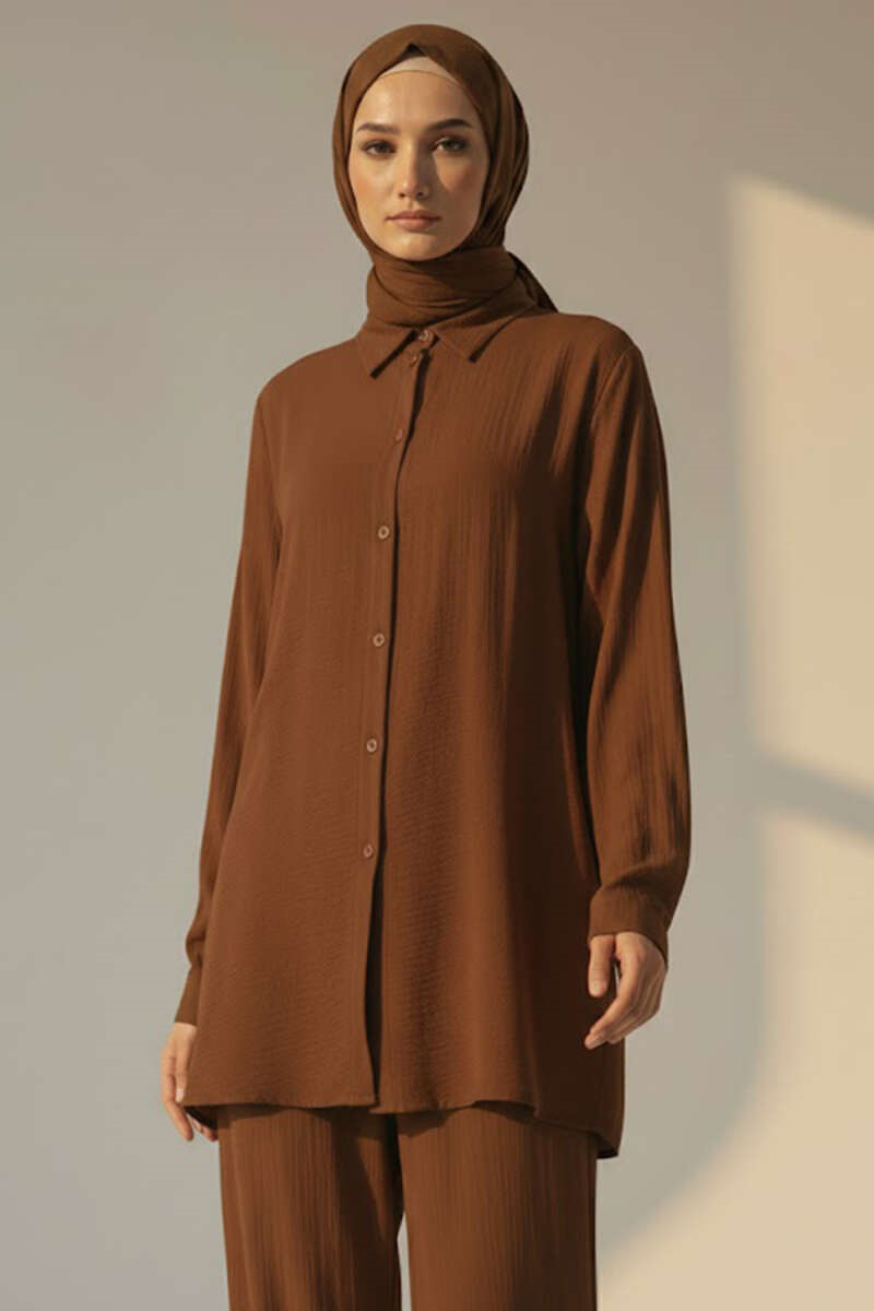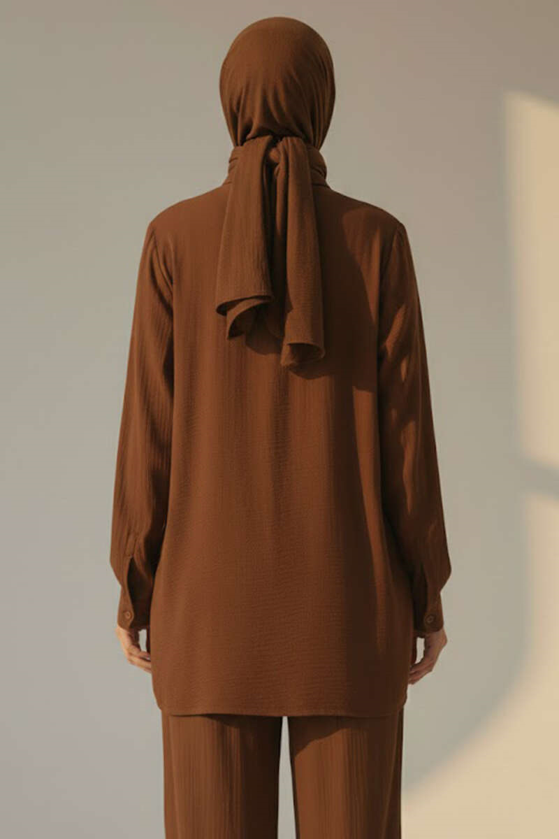 Crinkle-look Buttoned 2 Piece Set in tan. (0820-6710-727087)