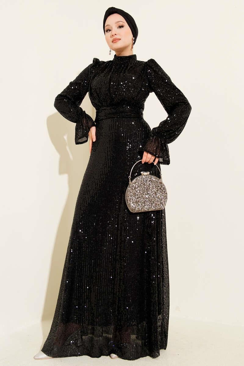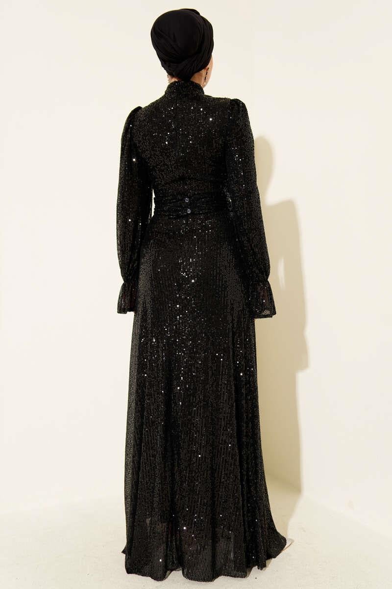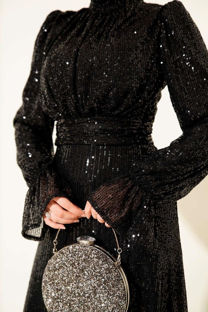 Belted Sequin Detailed Evening Dress Black (8163-4444-680404)
