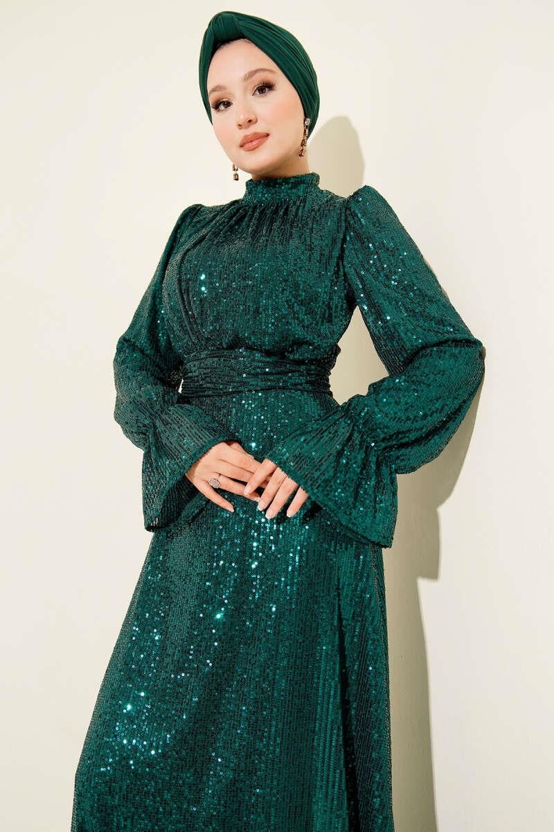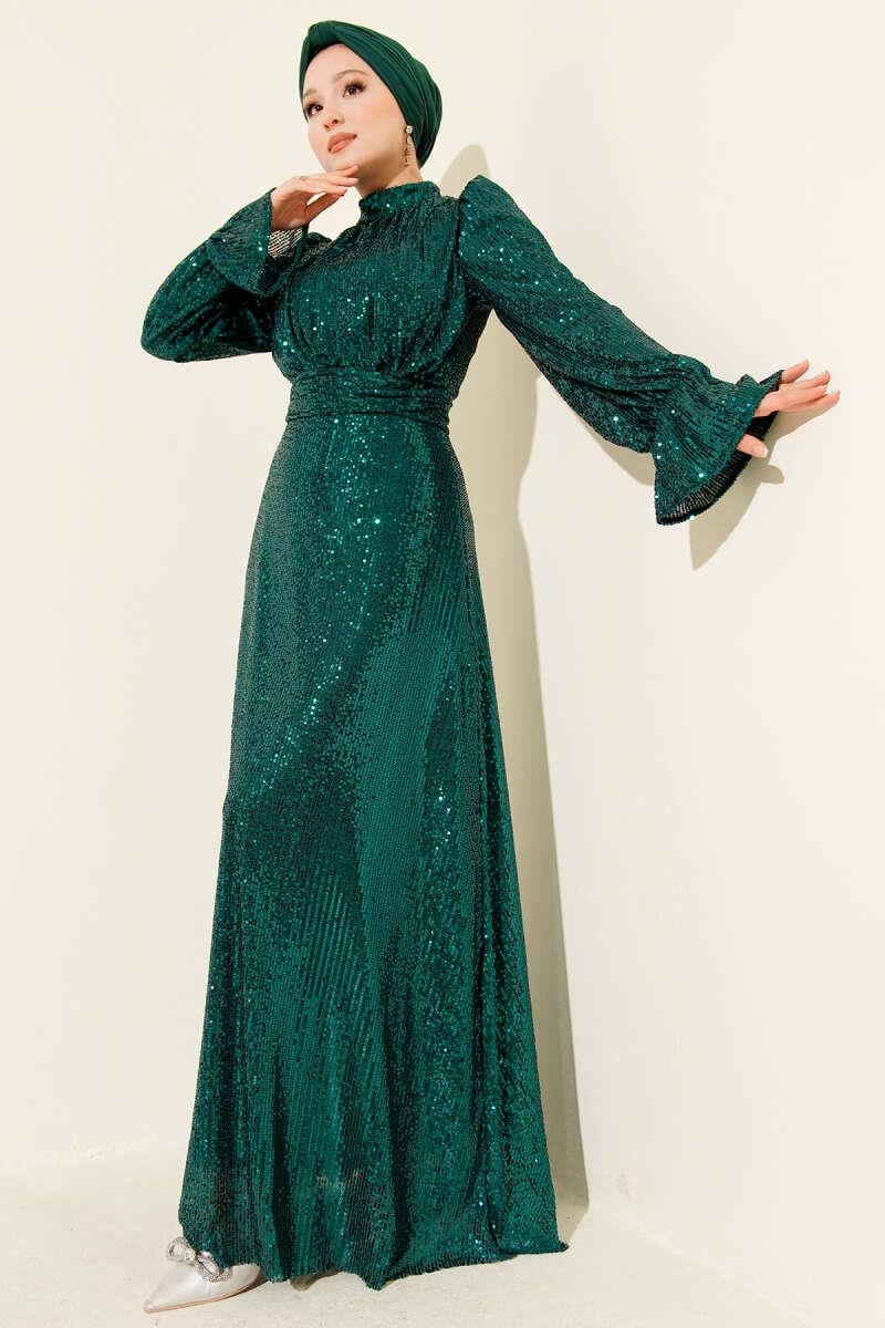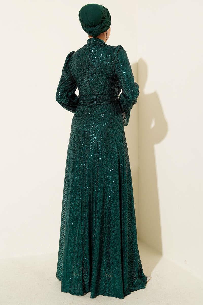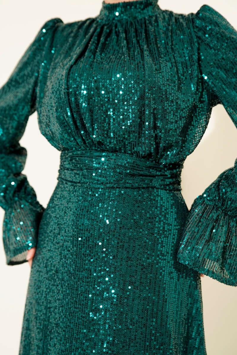 Belted Sequin Detailed Evening Dress Emerald Green (8163-4444-680408)