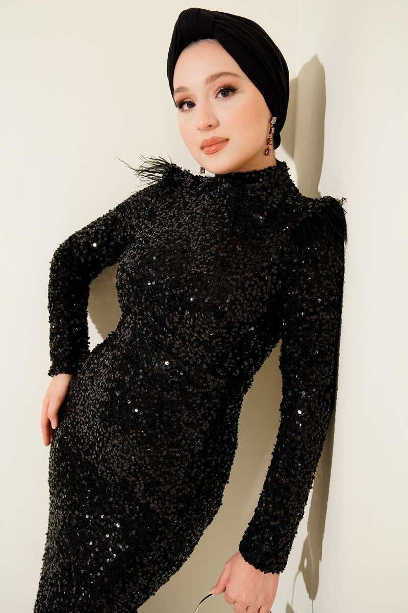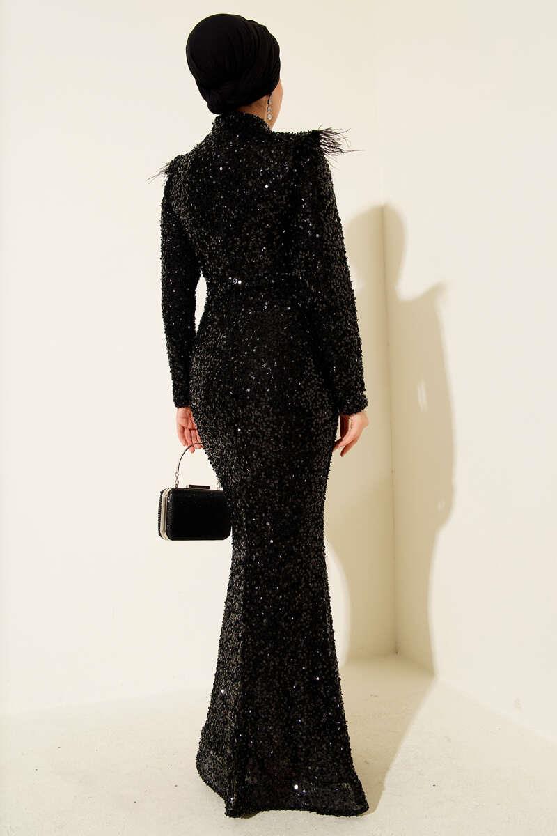 Sequin Evening Dress with Feathered Shoulders, Black (8163-4445-680335)