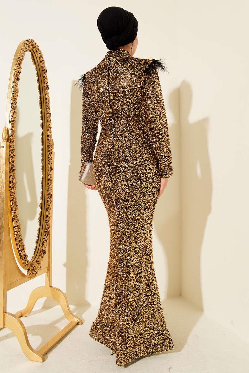 Sequin Evening Dress with Feathered Shoulders, Black and Gold (8163-4445-680331)