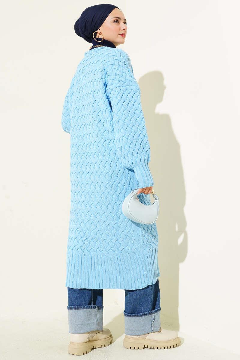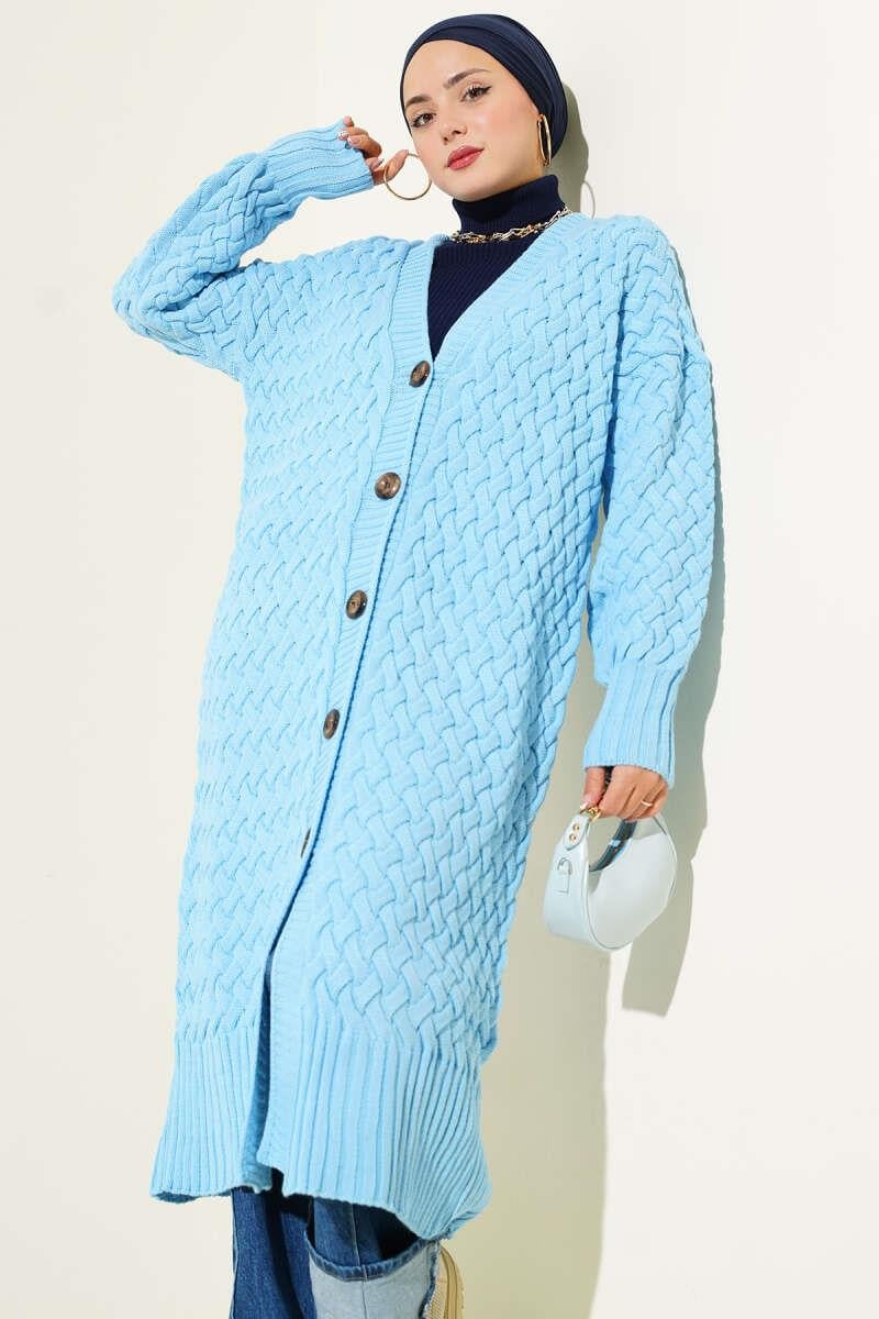 Boydan Düğmeli Sepet Örgü Uzun Hırka Gök Mavisi (0875-2907-685579)