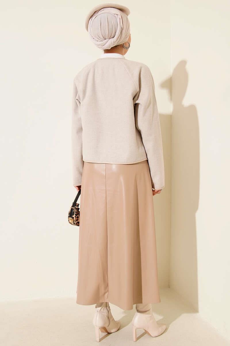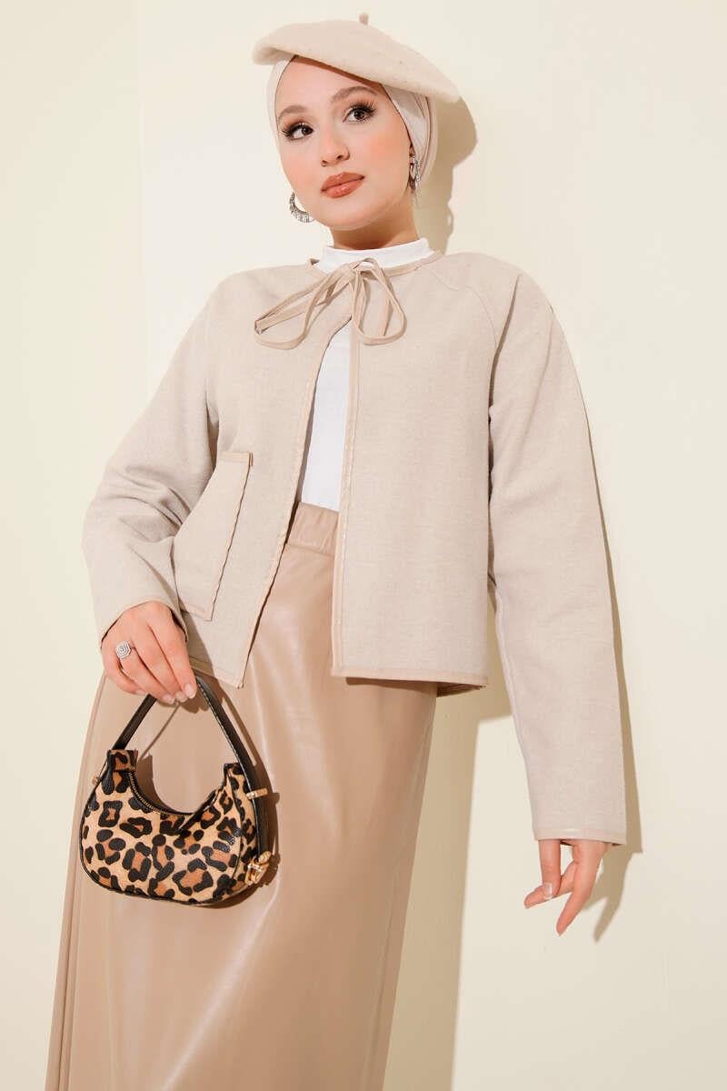 Deri Biyeli Kaşe Kısa Ceket Bej (0582-13079-671855)