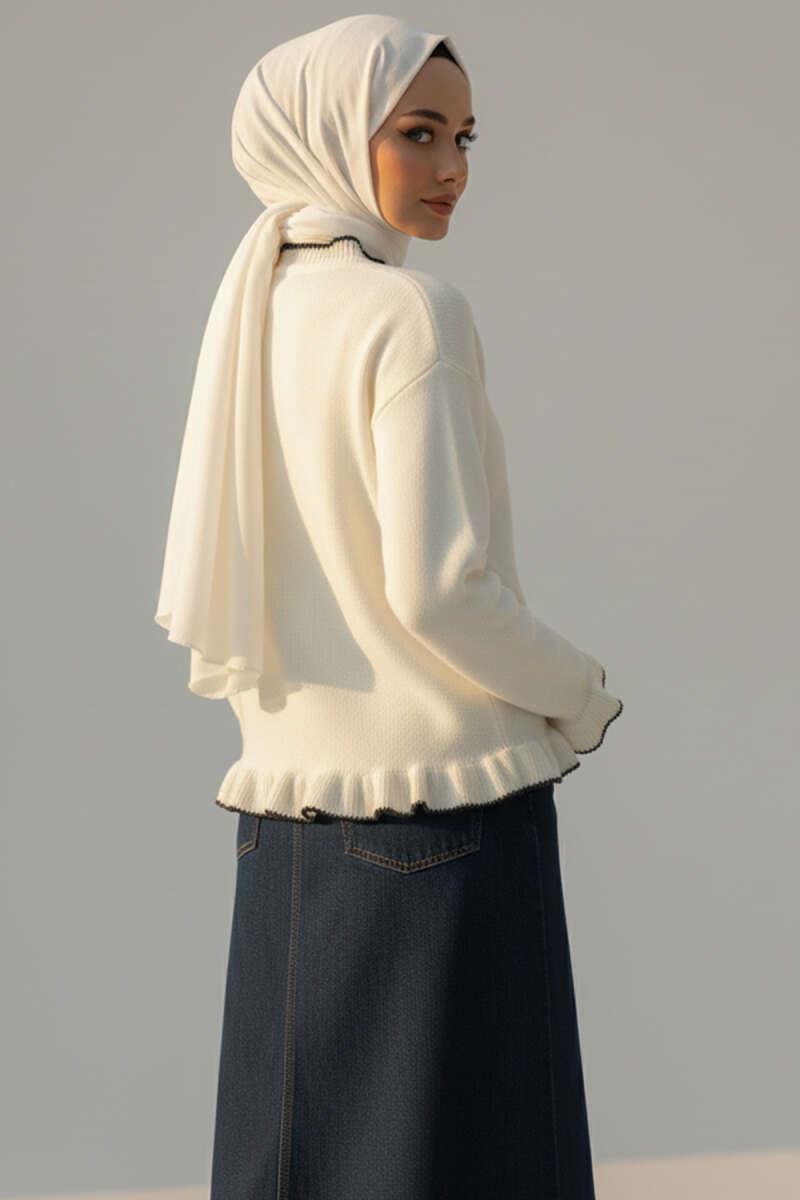 Fırfırlı İnci Düğmeli Triko Hırka Ekru (0537-6887-679605)