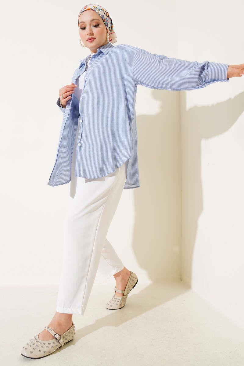 Gizli Düğmeli Çizgili Gömlek Mavi (0314-1147-656613)