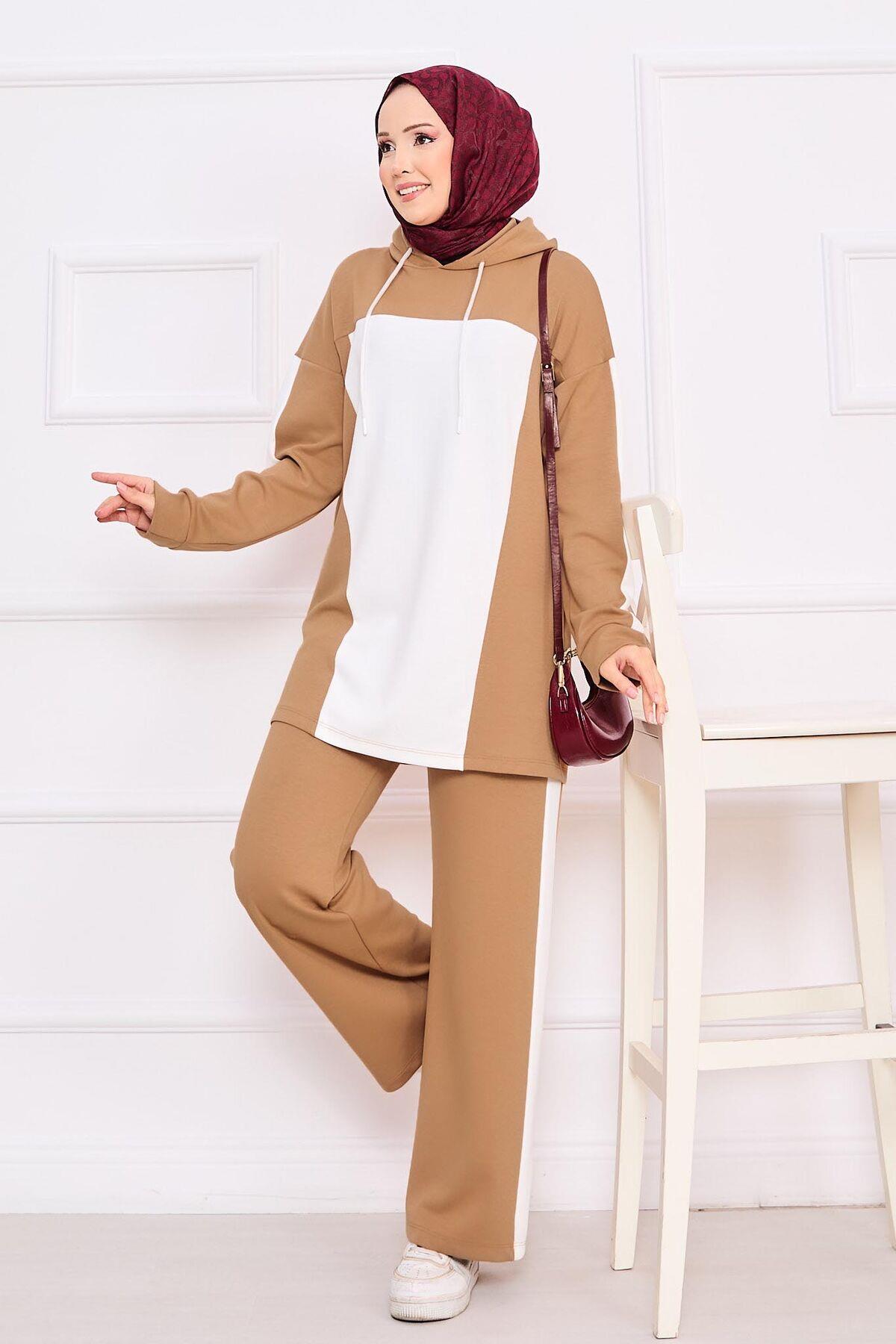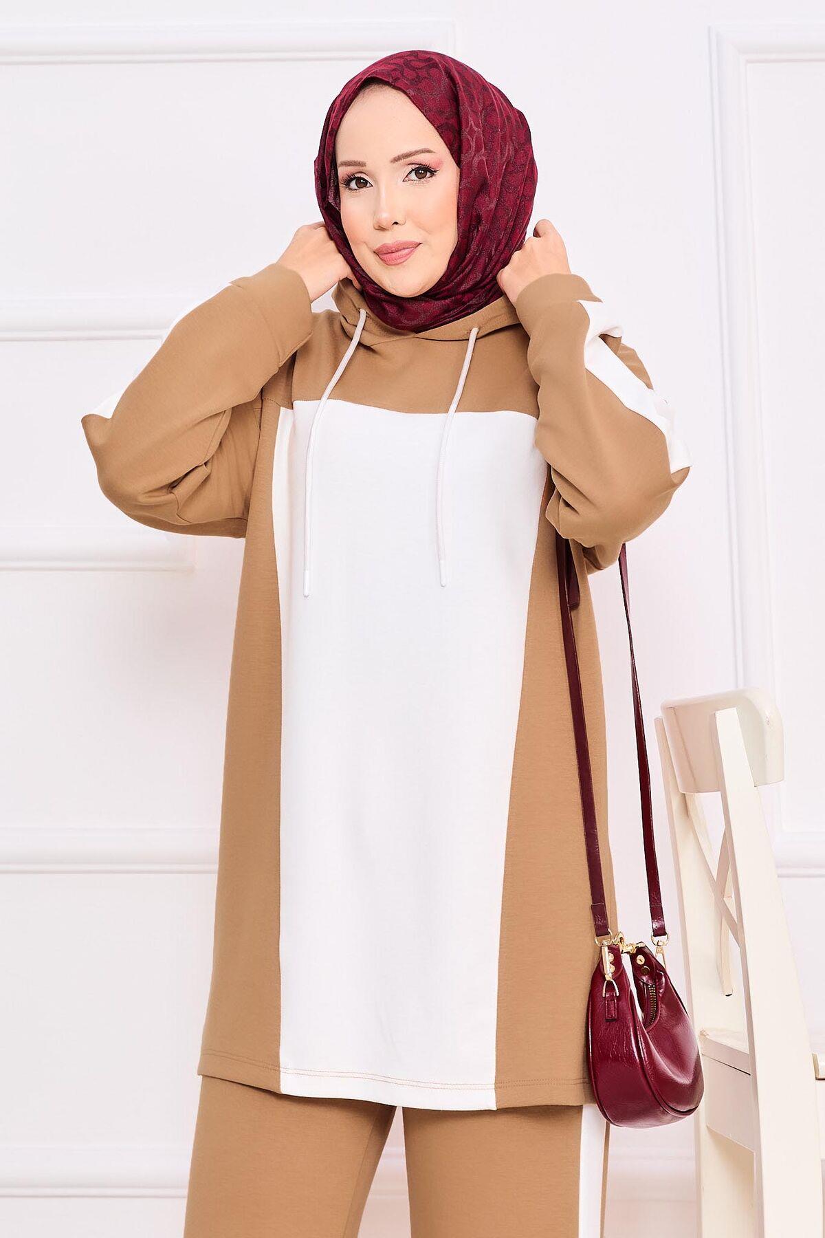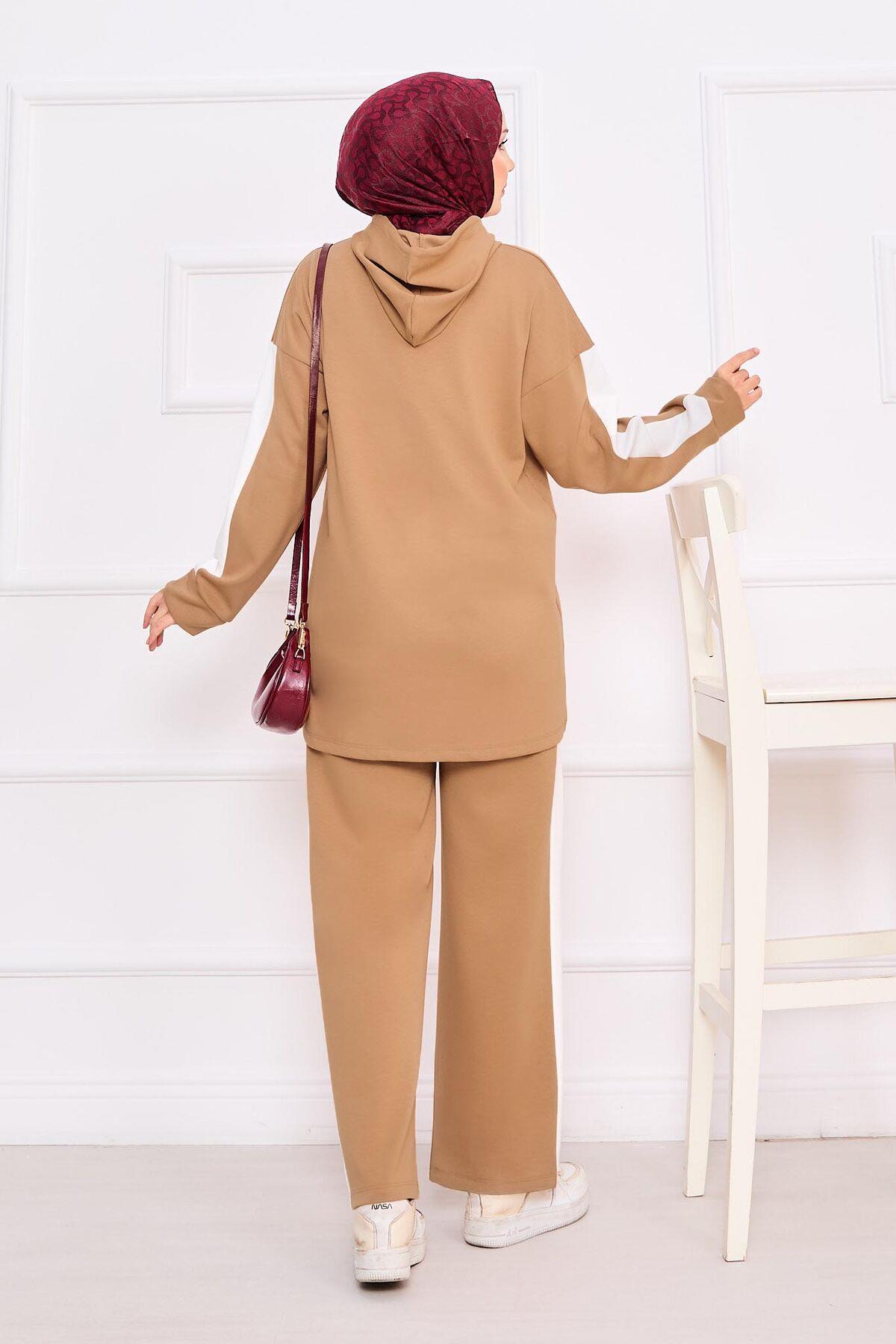 İki Renkli Kapüşonlu Tesettür İkili Takım Camel (125M00617865R09L)