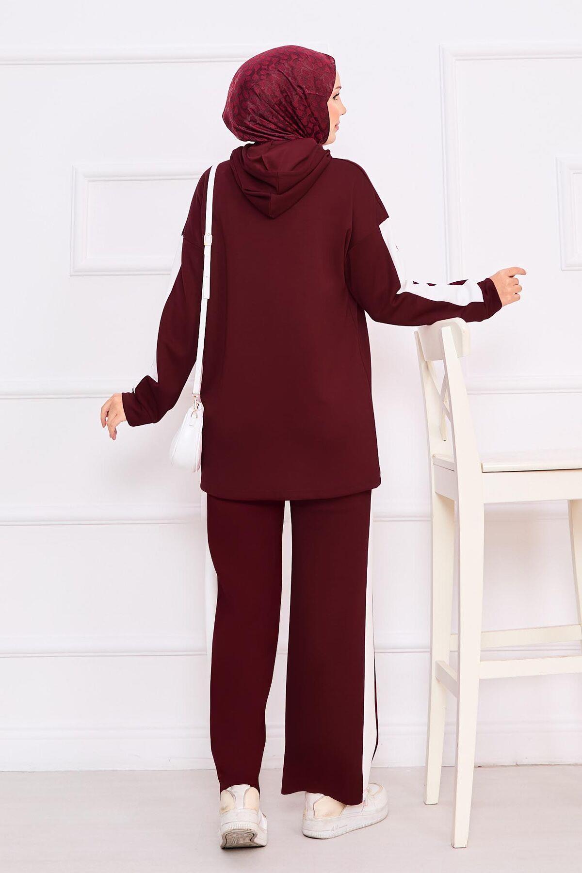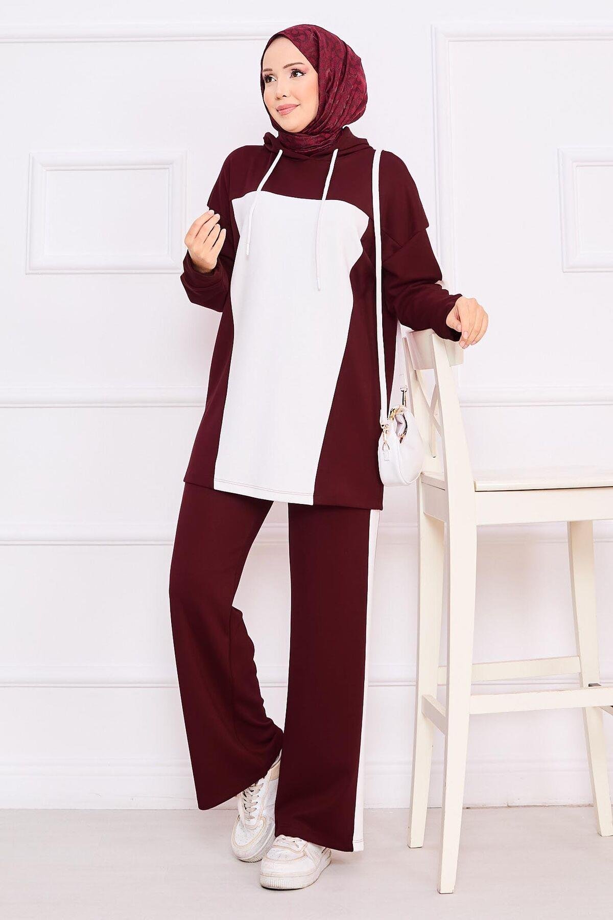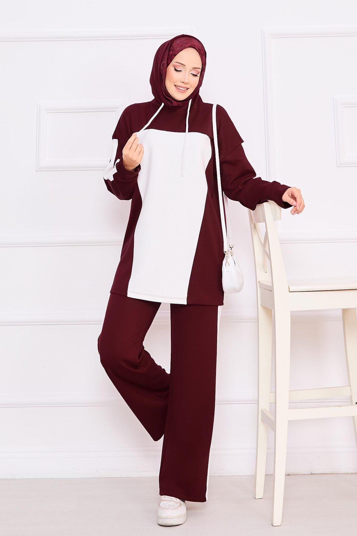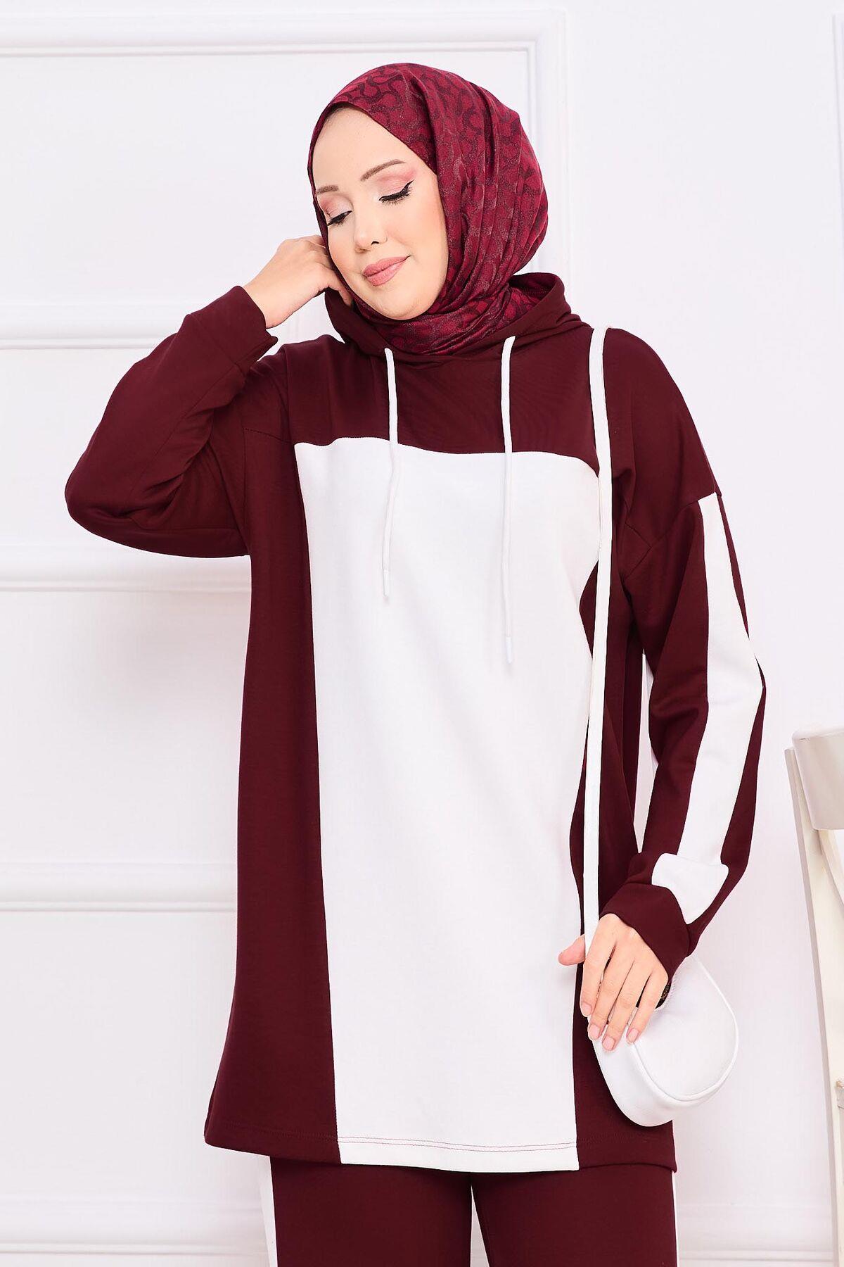 İki Renkli Kapüşonlu Tesettür İkili Takım Şarabi (125M00617865R57L)