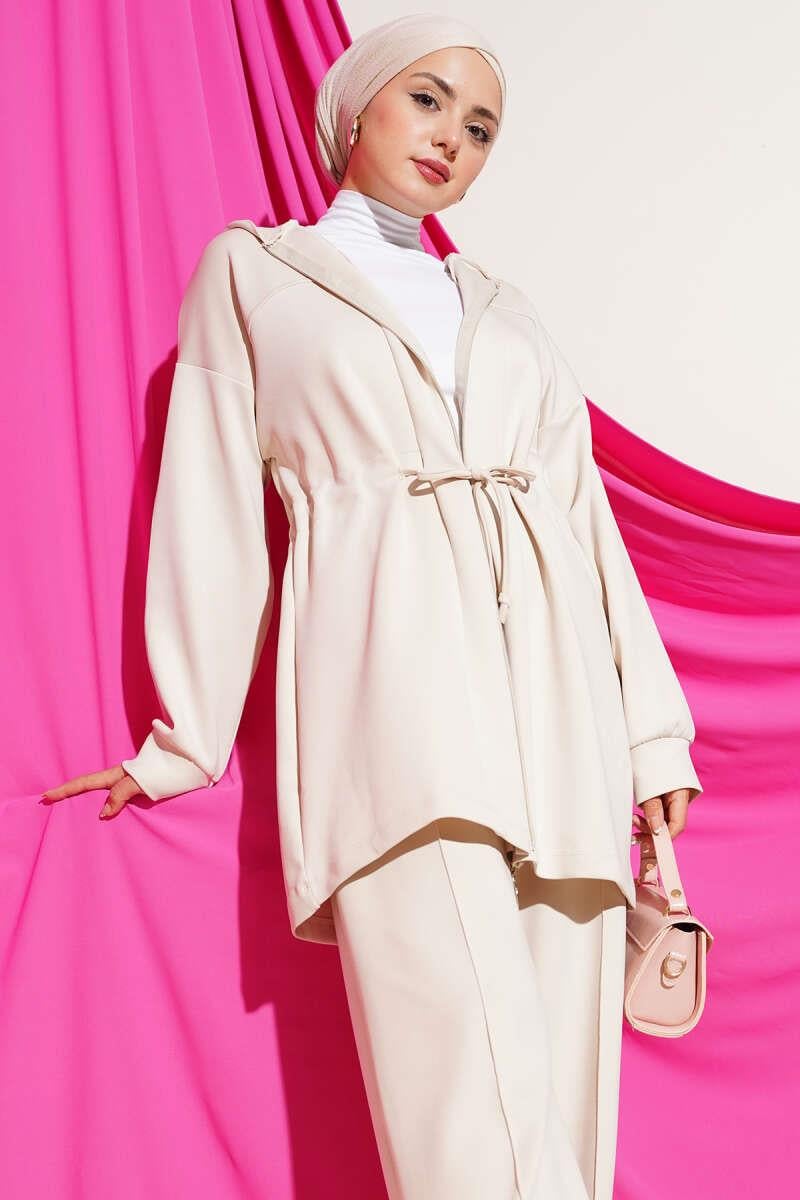 Kapüşonlu Bel Tünelli Bağcıklı İkili Takım Bej (0829-5335-685932)