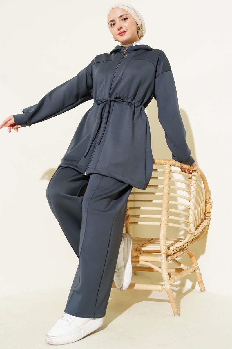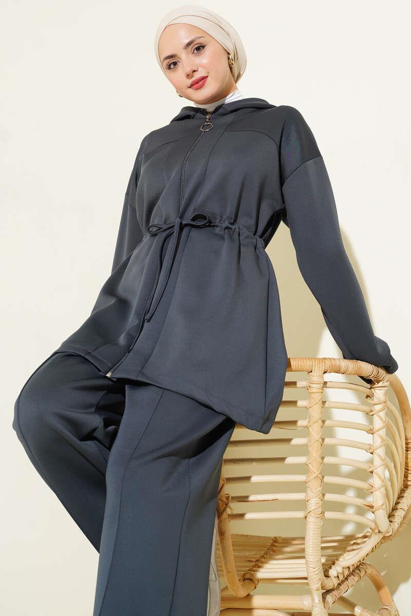 Kapüşonlu Bel Tünelli Bağcıklı İkili Takım Füme (0829-5335-685944)