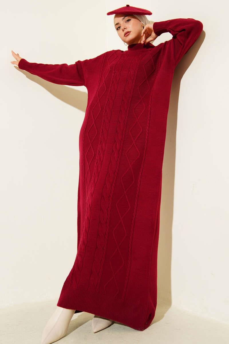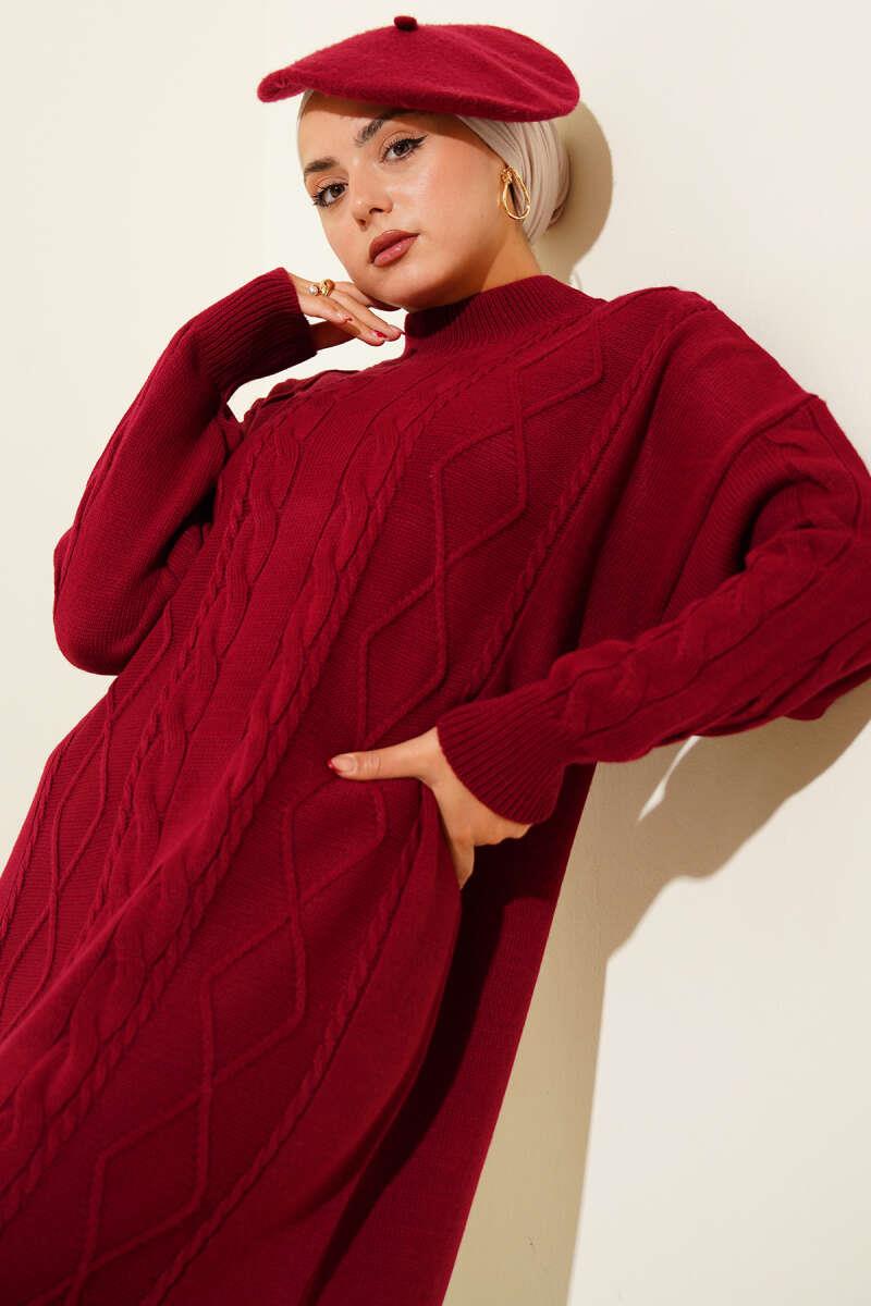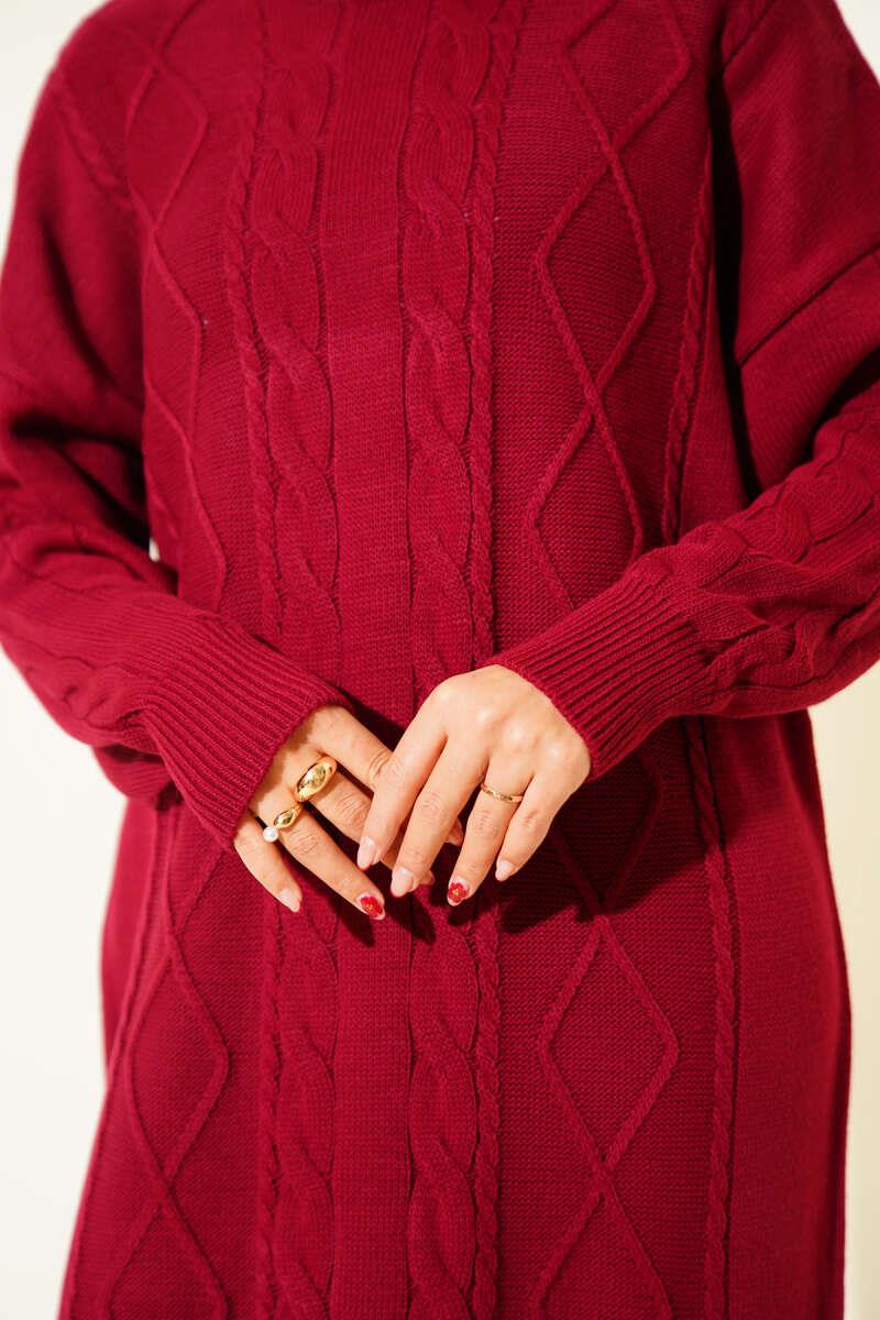 Kıvrım Örgülü Triko Elbise Bordo (0875-4440-670230)