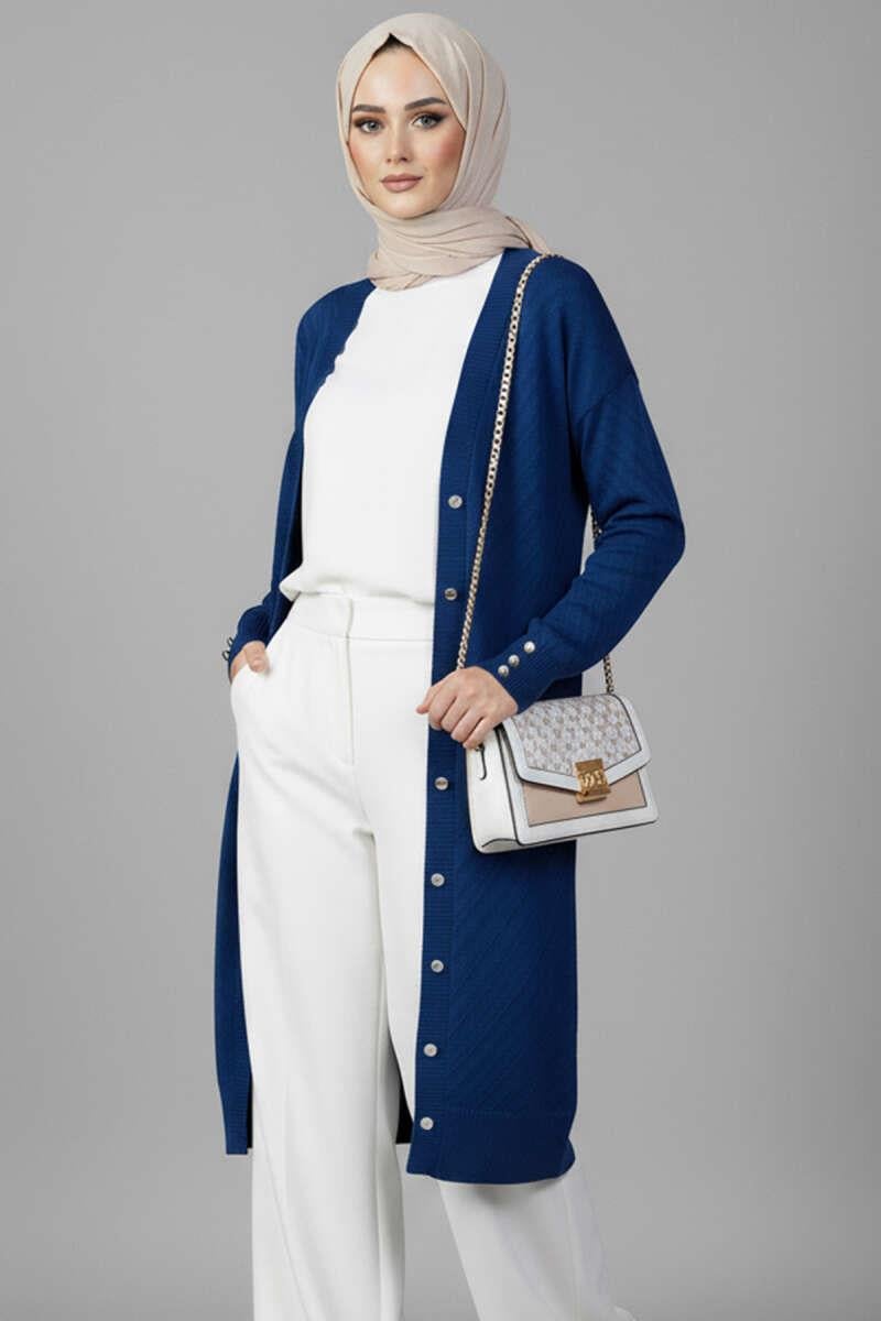 Kol Düğme Detaylı Triko Hırka Saks (6999-3198-676960)
