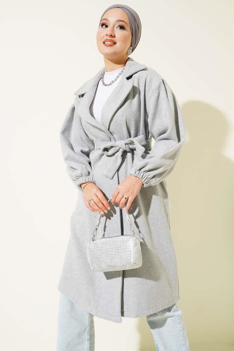 Kruvaze Yaka Belden Bağlamalı Kaban Gri (0428-3062-676298)
