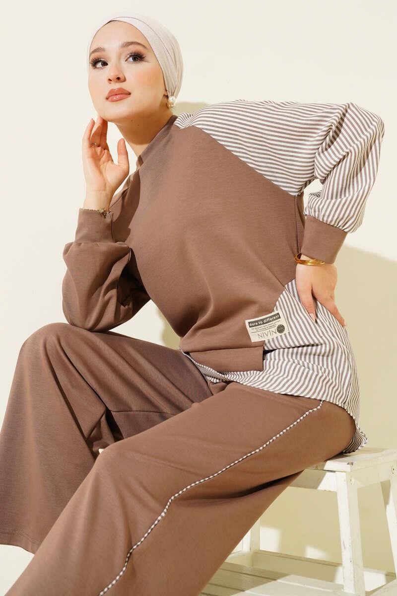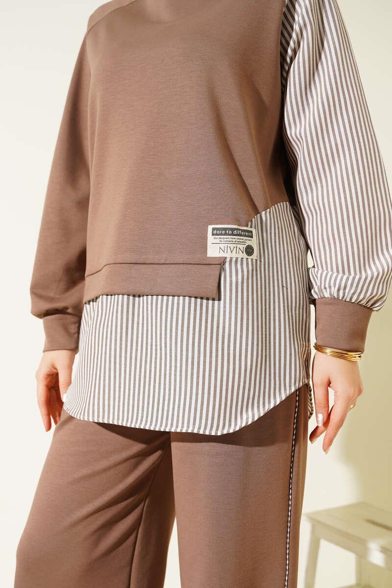 Loyşa Çizgi Garnili Tunik İkili Takım Vizon (0643-18698-675518)