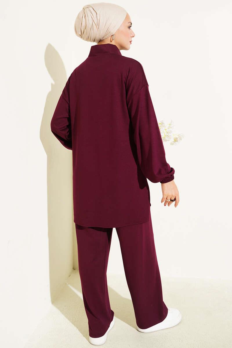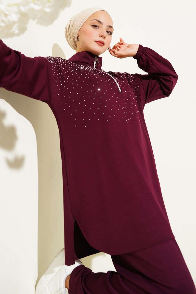 Loyşa Omuz Taşlı Fermuarlı İkili Takım Mürdüm (0829-5317-679187)
