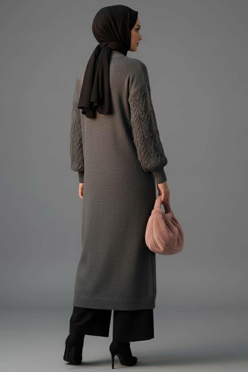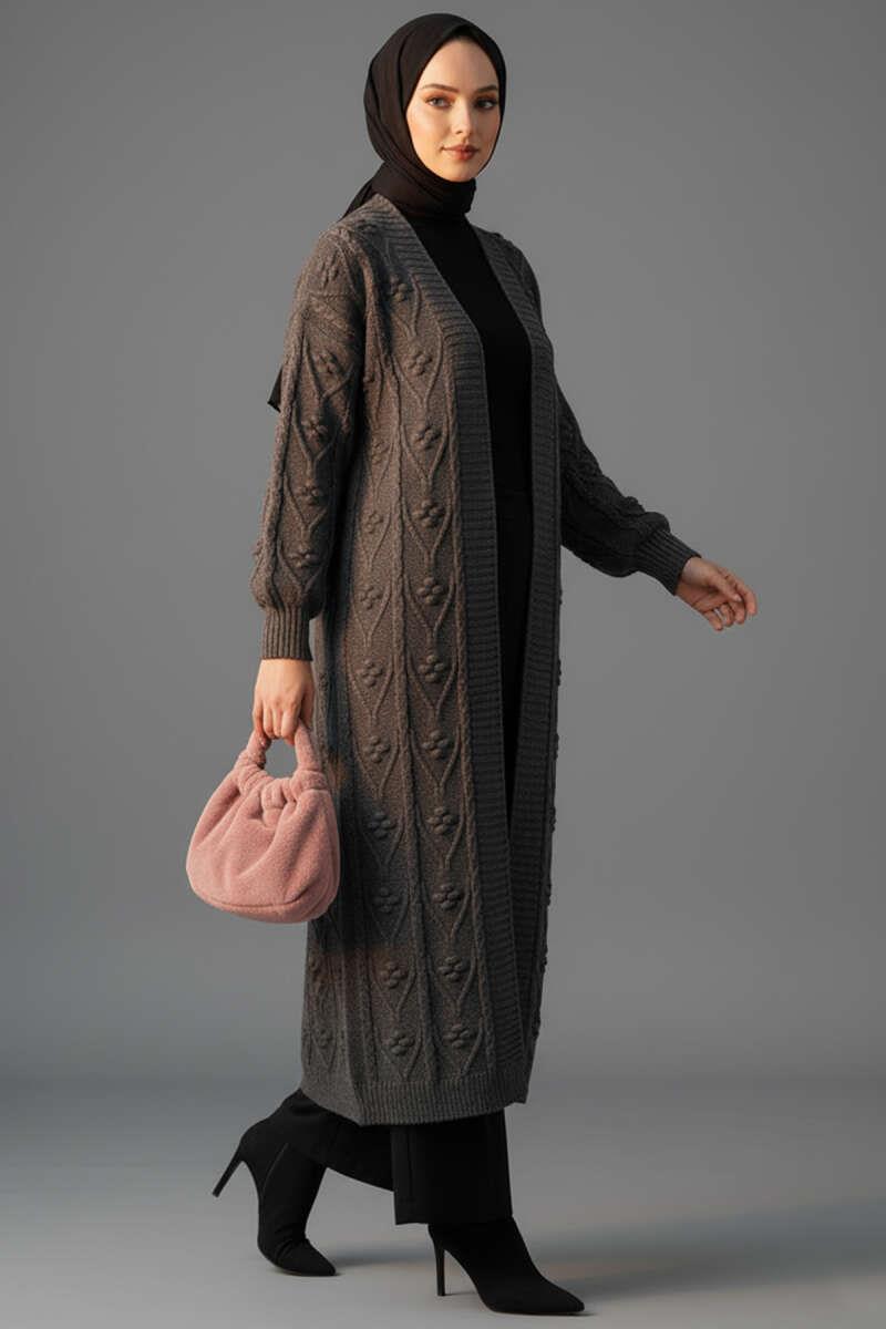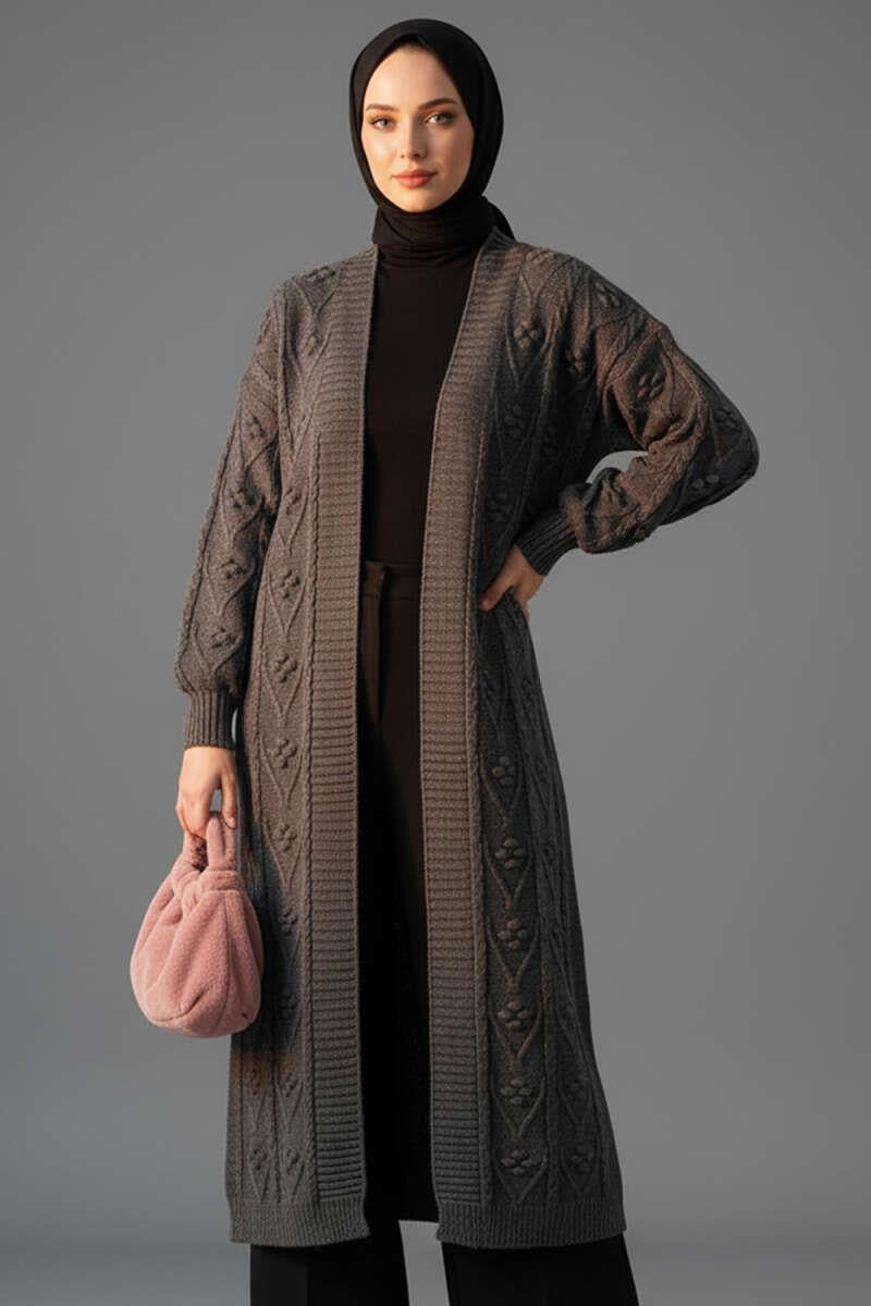 Örgü Kabartma Desenli Uzun Triko Hırka Füme (0875-4222-670428)