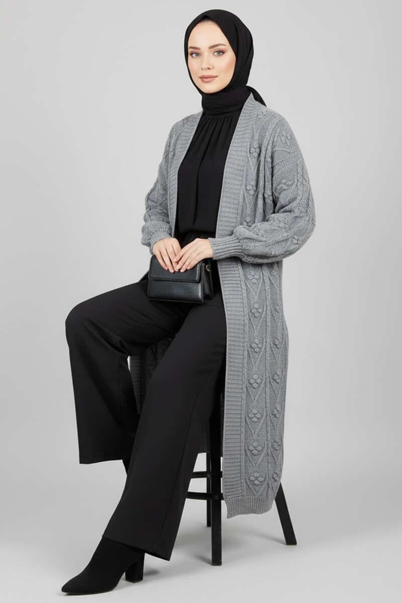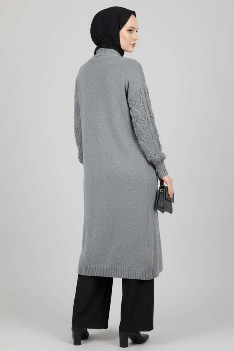 Örgü Kabartma Desenli Uzun Triko Hırka Gri (0875-4222-670429)