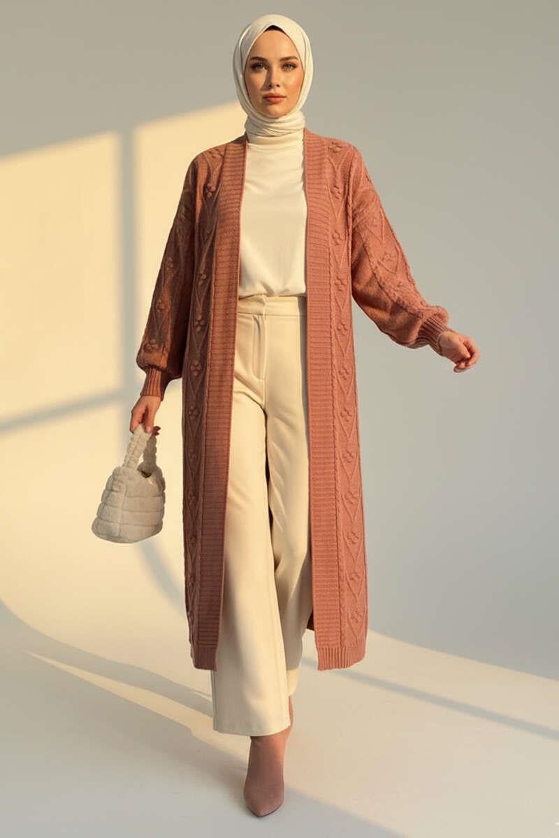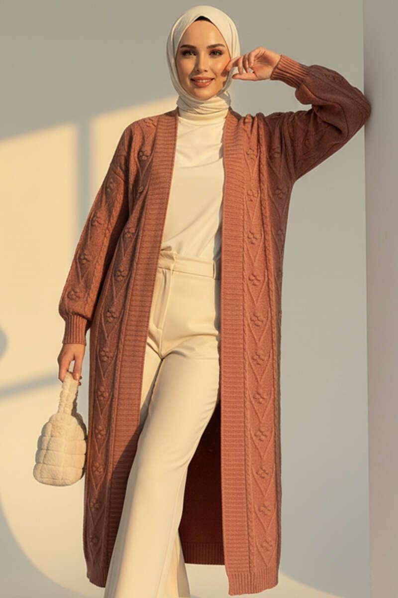 Örgü Kabartma Desenli Uzun Triko Hırka Gül Kurusu (0875-4222-670430)