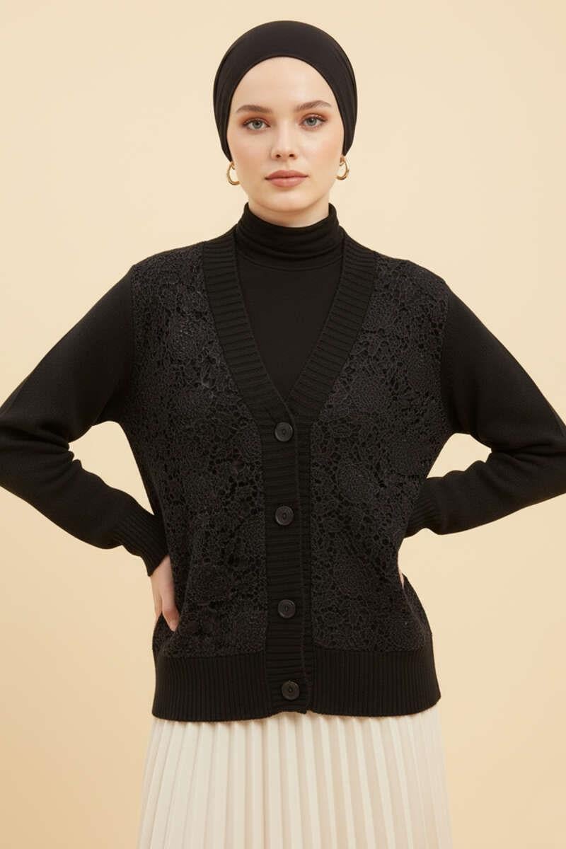 Pullu Dantelli Kısa Triko Hırka Siyah (8378-25562-683178)