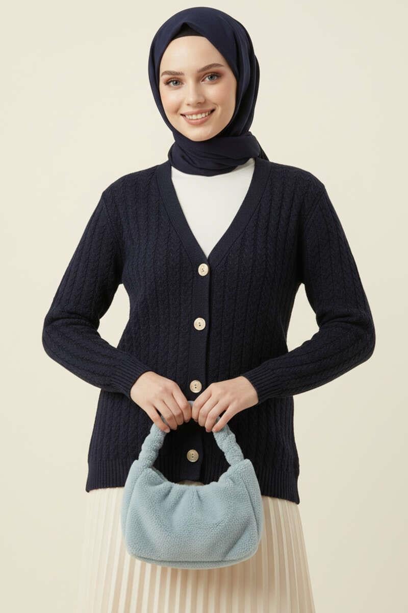 Saç Örgülü Düğmeli Triko Hırka Lacivert (6999-478-681845)