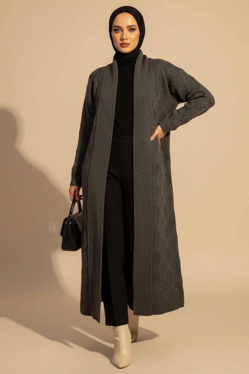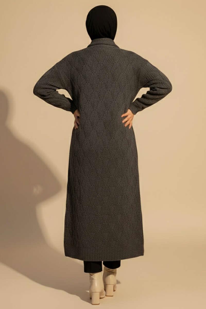 Şal Yaka Örgü Desenli Uzun Triko Hırka Füme (0875-4393-669695)