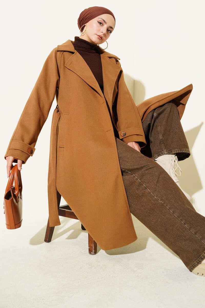 Tahta Düğmeli Kruvaze Yaka Kaşe Kaban Taba (0569-3216-677272)