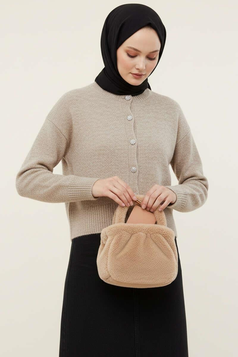 Taş Düğmeli Yumoş Triko Kısa Hırka Kahve (8374-0929-688391)